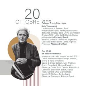 Presentazione della ristampa anastatica dell’editio princeps della Divina Commedia (Foligno 1472) edita dall’Editoriale Campi e illustrata da Roberto Barni. Saranno presenti l’artista e il segretario generale della Società Dante Alighieri Alessandro Masi.