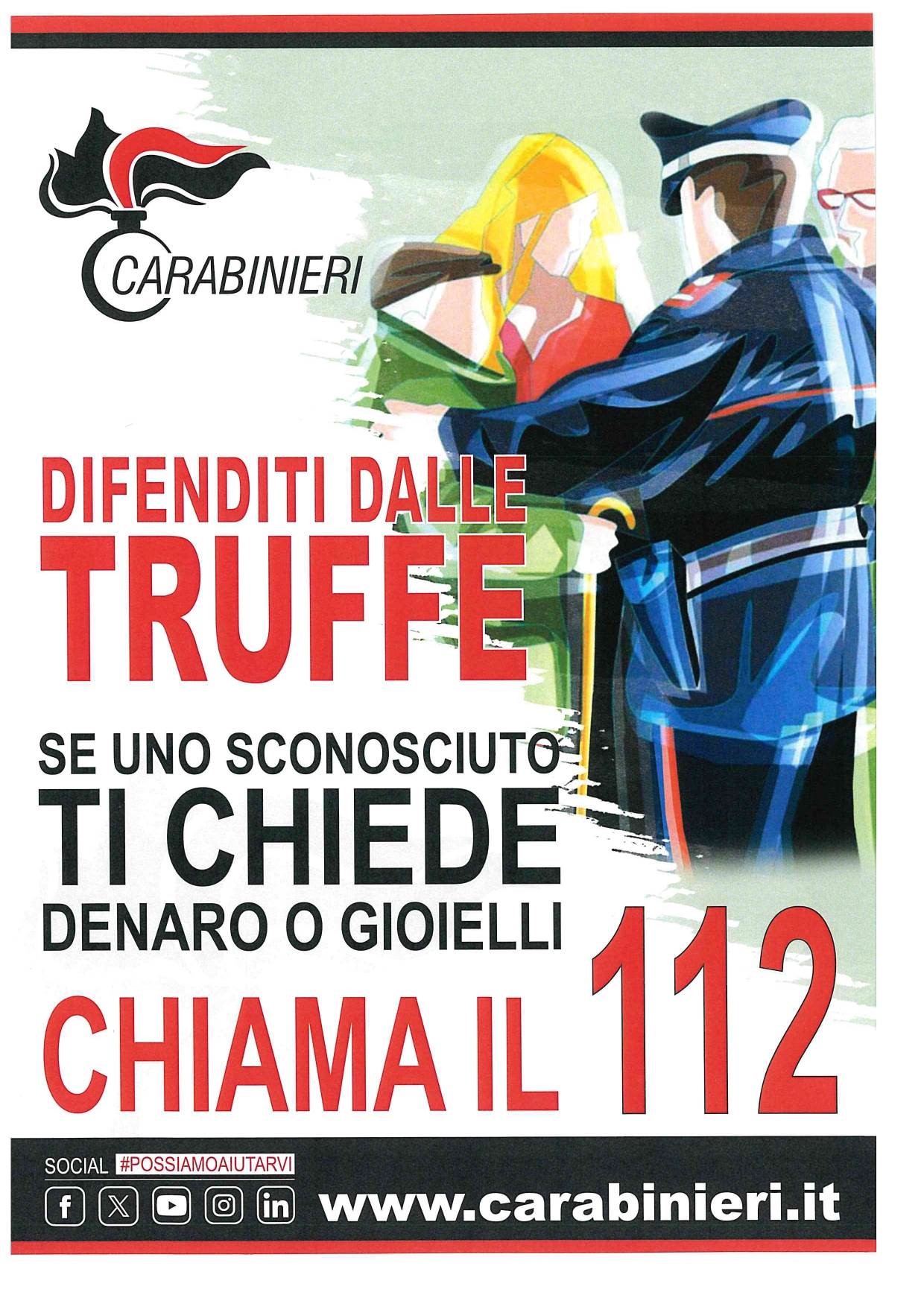 Il Comando Provinciale Carabinieri Perugia riporta l'attenzione sul rischio di subire truffe ricordando di rivolgersi ai Carabinieri di fronte a qualsiasi sospetto di raggiro, chiamando il numero 112.