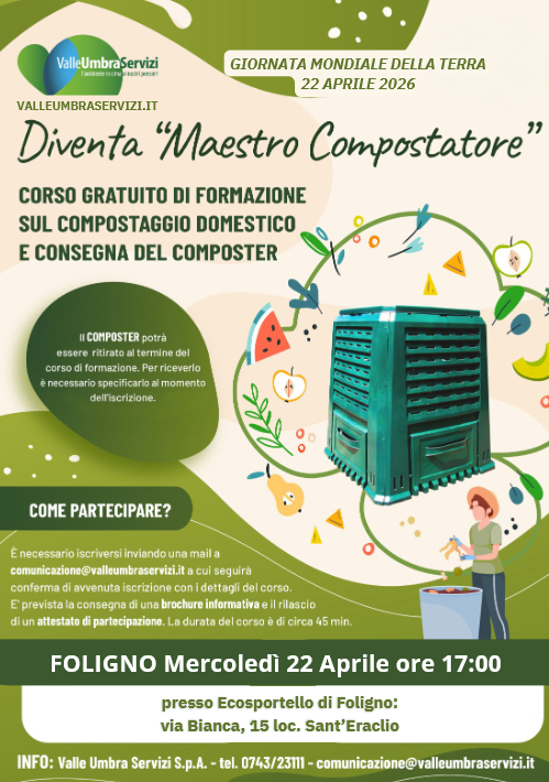 In occasione della Giornata mondiale della terra, Valle Umbra Servizi organizza un corso gratuito di formazione sul compostaggio domestico, tenuto da un esperto agronomo, con possibilità di ritiro della compostiera. L’iniziativa è rivolta ai cittadini interessati ad approfondire una pratica semplice e concreta per ridurre i rifiuti organici e contribuire alla tutela dell’ambiente.