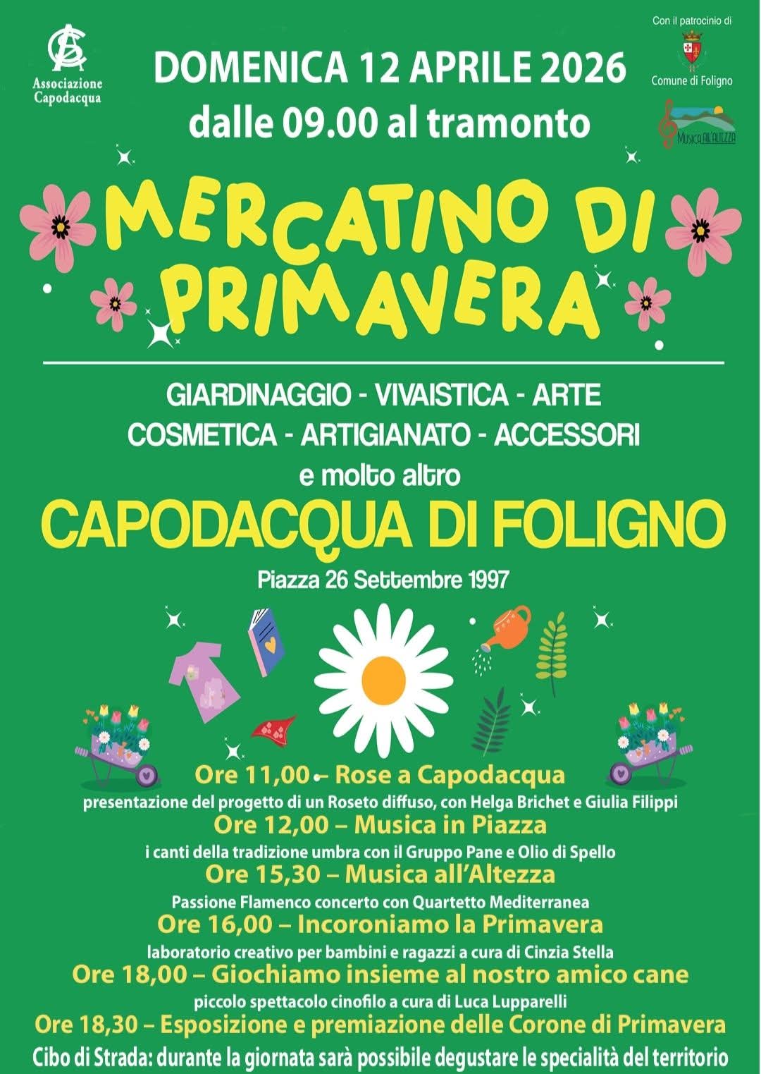 Domenica 12 aprile, dalle 9 al tramonto a Capodacqua (piazza 26 settembre 1997), torna il “Mercatino di primavera” con stand di giardinaggio, vivaistica, arte, cosmetica, artigianato e accessori.