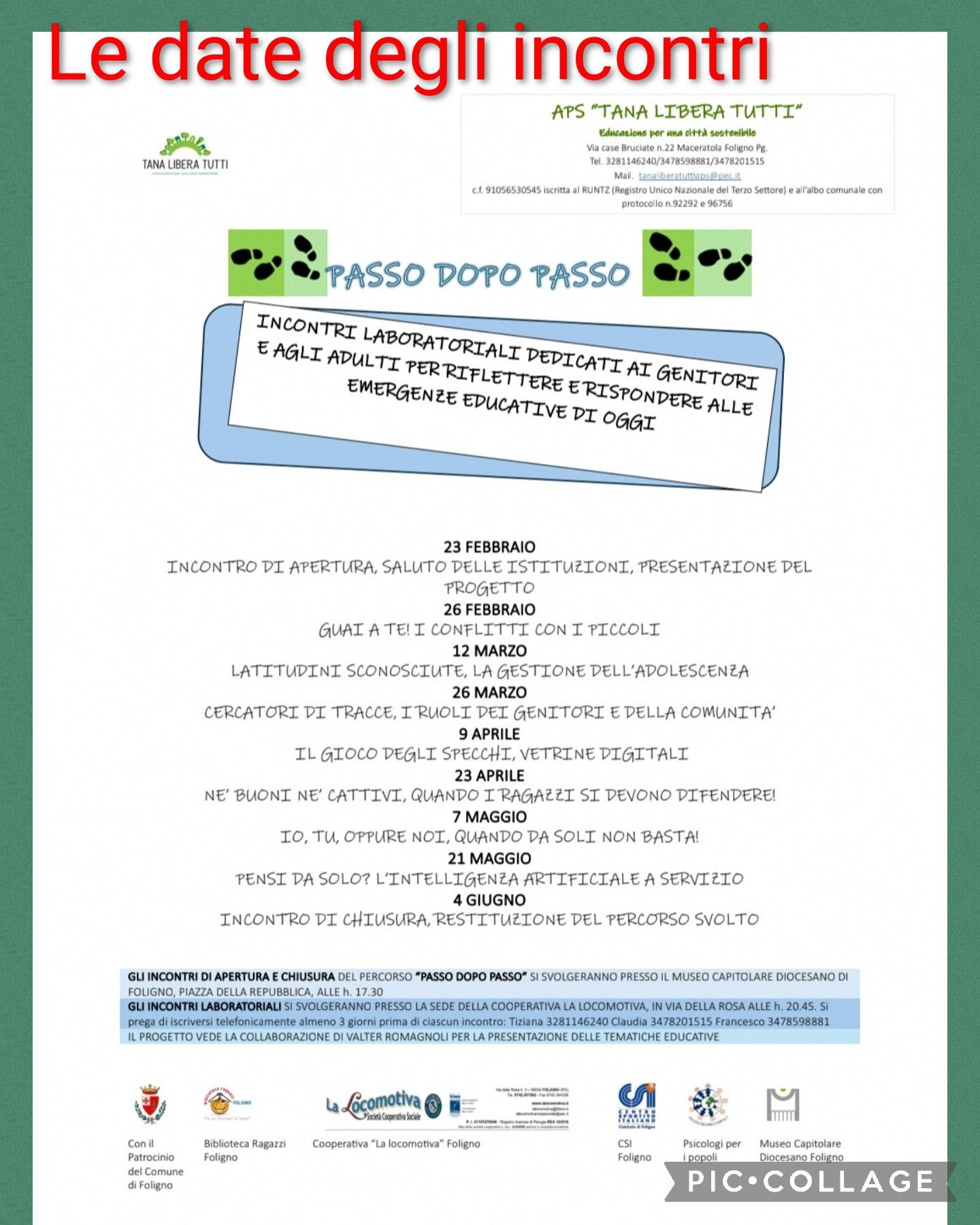 Gli incontri si svolgono alle 20.45, nella sede della Cooperativa Sociale La Locomotiva, via della Rosa 3, Foligno