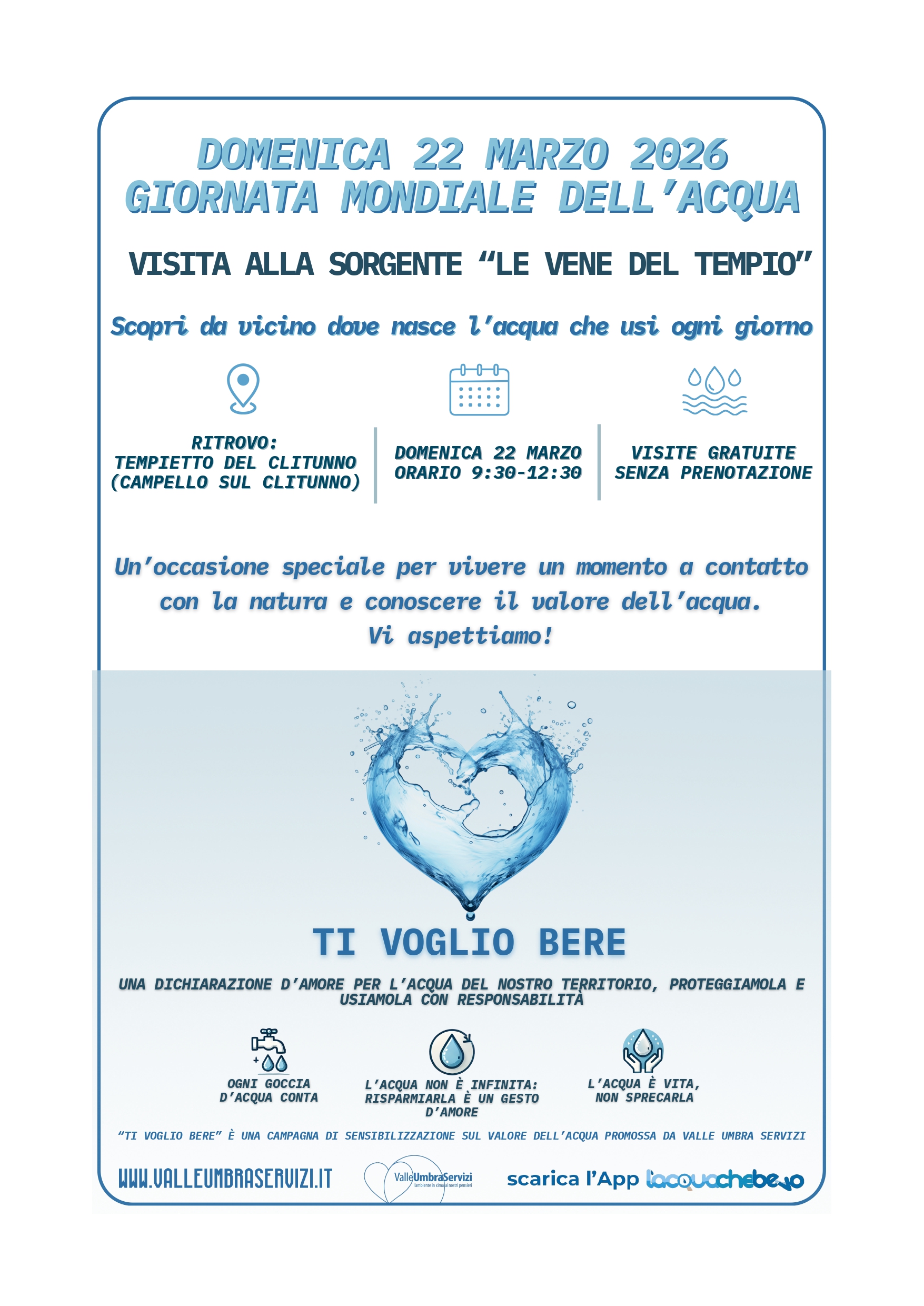 All’interno di questa campagna, domenica 22 marzo è prevista un’apertura straordinaria al pubblico della sorgenteLe Vene del Tempio” a Campello sul Clitunno, con visite guidate gratuite rivolte a cittadini, famiglie e associazioni. Si tratta di un’occasione concreta per vivere il territorio, conoscere da vicino il ciclo dell’acqua e condividere un momento di consapevolezza ambientale.