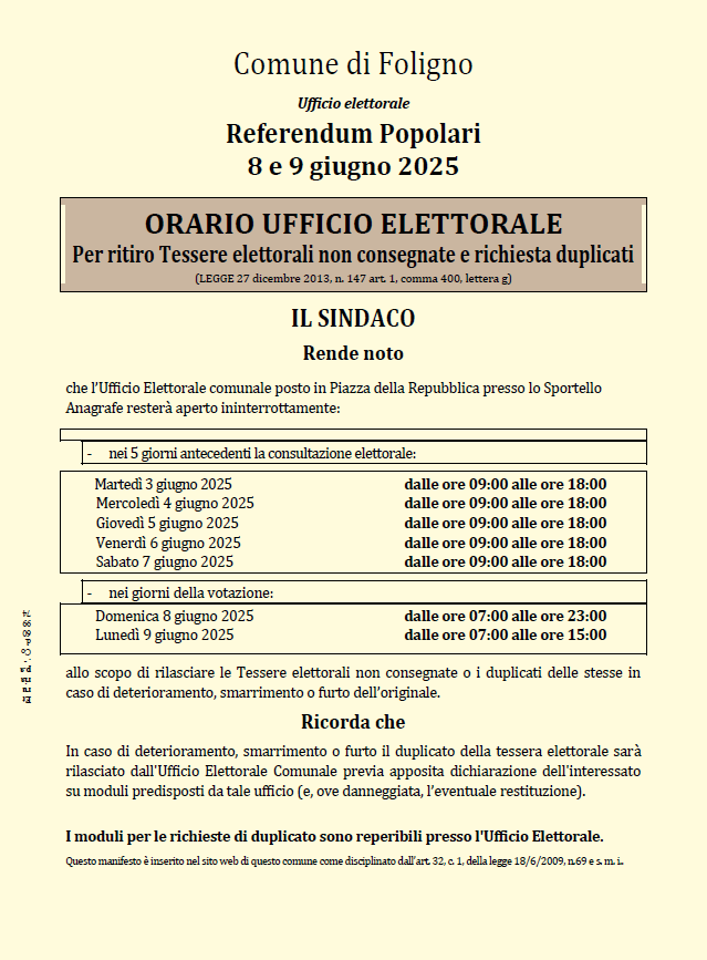 In occasione dei Referendum, l’ufficio elettorale del Comune – per il ritiro delle tessere elettorali non consegnate o per la richiesta di duplicati – sarà aperto con orario continuato (dalle 9 alle 18) nei giorni di martedì 3, mercoledì 4, giovedì 5, venerdì 6 e sabato 7 giugno 2025.