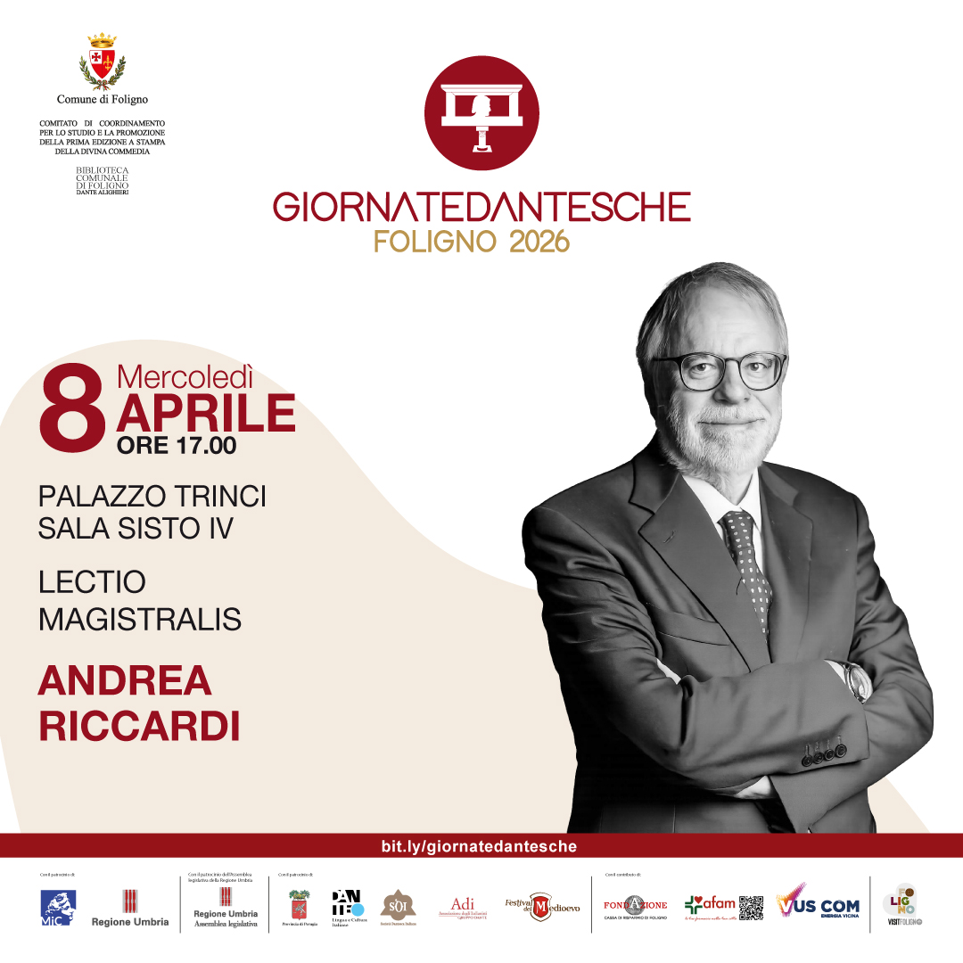 Filo rosso della manifestazione è l’undicesimo canto del Paradiso, in cui Dante racconta la vita di san Francesco attraverso le parole di san Tommaso. Proprio Francesco — nato non lontano da Foligno, nella terra attraversata dal fiume Topino evocato da Dante con una celebre perifrasi, e protagonista nella piazza principale della città del gesto radicale con cui rinunciò ai beni terreni — sarà al centro della manifestazione: a ottocento anni dalla sua morte, le Giornate dantesche rendono omaggio al santo più amato, una delle figure più significative del pensiero medievale, il cui messaggio continua ancora oggi a interrogare e scuotere le coscienze.