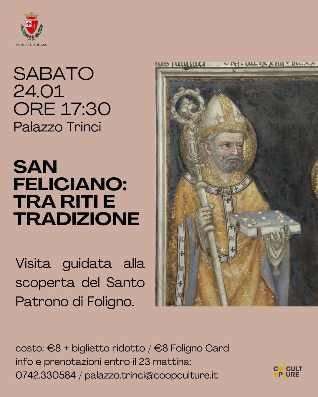 In occasione della festa di San Feliciano, patrono della città, vi aspettiamo per un’interessante visita guidata dedicata ai riti, alle tradizioni popolari e alla storia del Santo, per scoprire il profondo legame tra Foligno e la sua festa più sentita.
