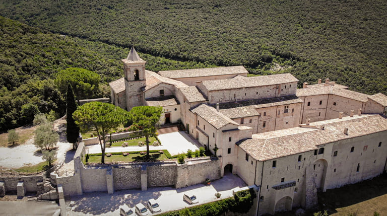 Arroccata in un idilliaco paesaggio naturale, tra boschi di lecci e olivi secolari, l’Abbazia, fondata nella seconda metà del sec. XI sui resti di una preesistente residenza fortificata dei Monaldi, offre all’interno del suo vasto complesso, importanti testimonianze storiche ed artistiche e suggestivi scorci architettonici: dalla Chiesa, in cui sono conservati frammenti di affreschi quattrocenteschi, alla Cripta di San Marone, eremita siro-babilonese vissuto nel IV secolo, alla Loggia del Paradiso con frammenti di affreschi monocromi probabile opera di Giovanni di Corraduccio, allo splendido Chiostro romanico opera del maestro romano Pietro de Maria.