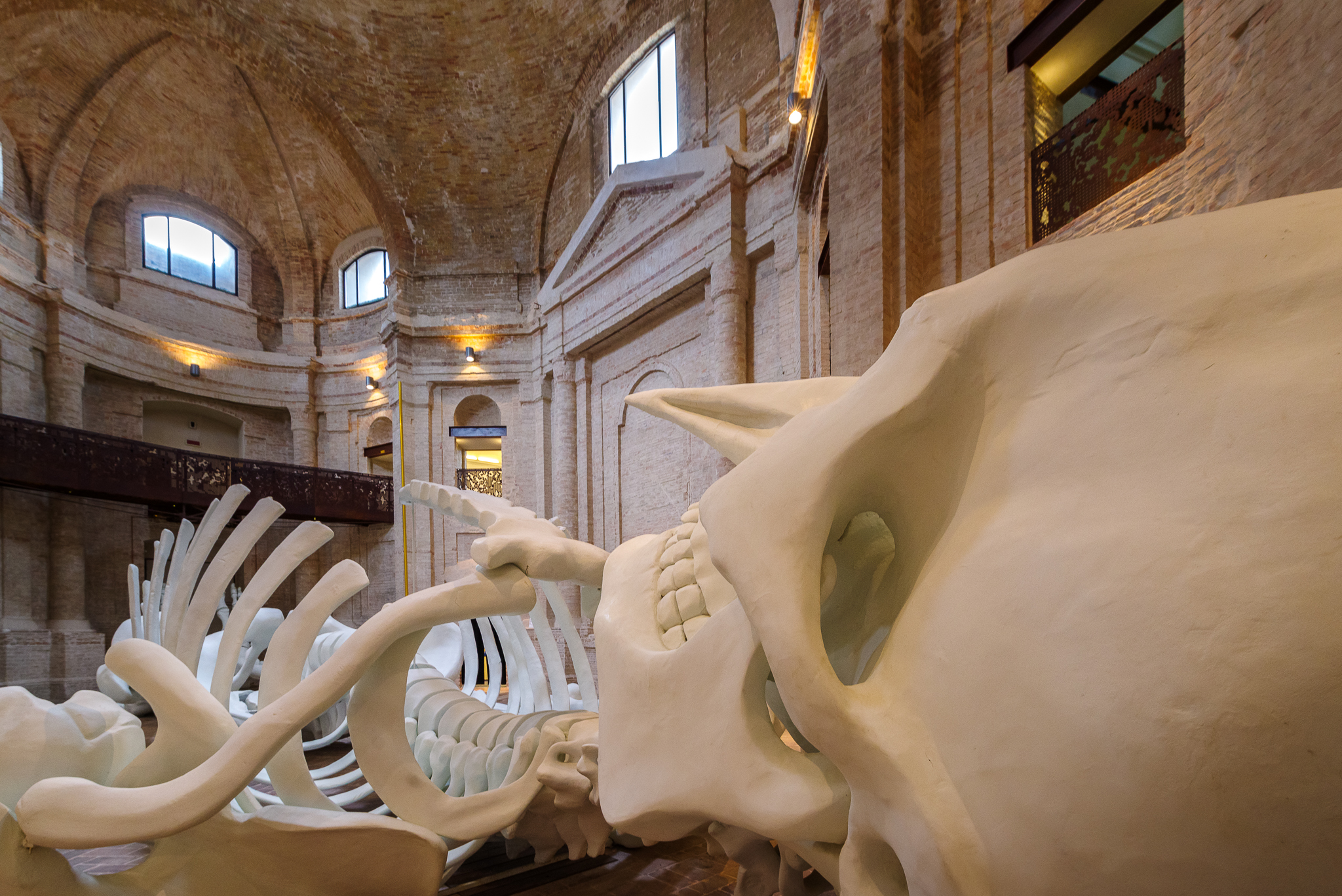 The artwork Calamita Cosmica (Cosmic Magnet) measures 24 meters in length and 4 meters in width, representing a detailed human skeleton with a large bird beak in place of the nose. The skeleton lies on its back, supporting a golden iron rod balanced on the last phalanx of the right middle finger. The rod symbolizes the magnet connecting the earth to the sky, intending to evoke a sense of inferiority and subjection of humans to the superhuman and inaccessible.
