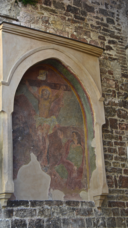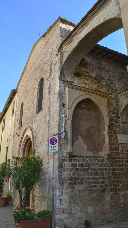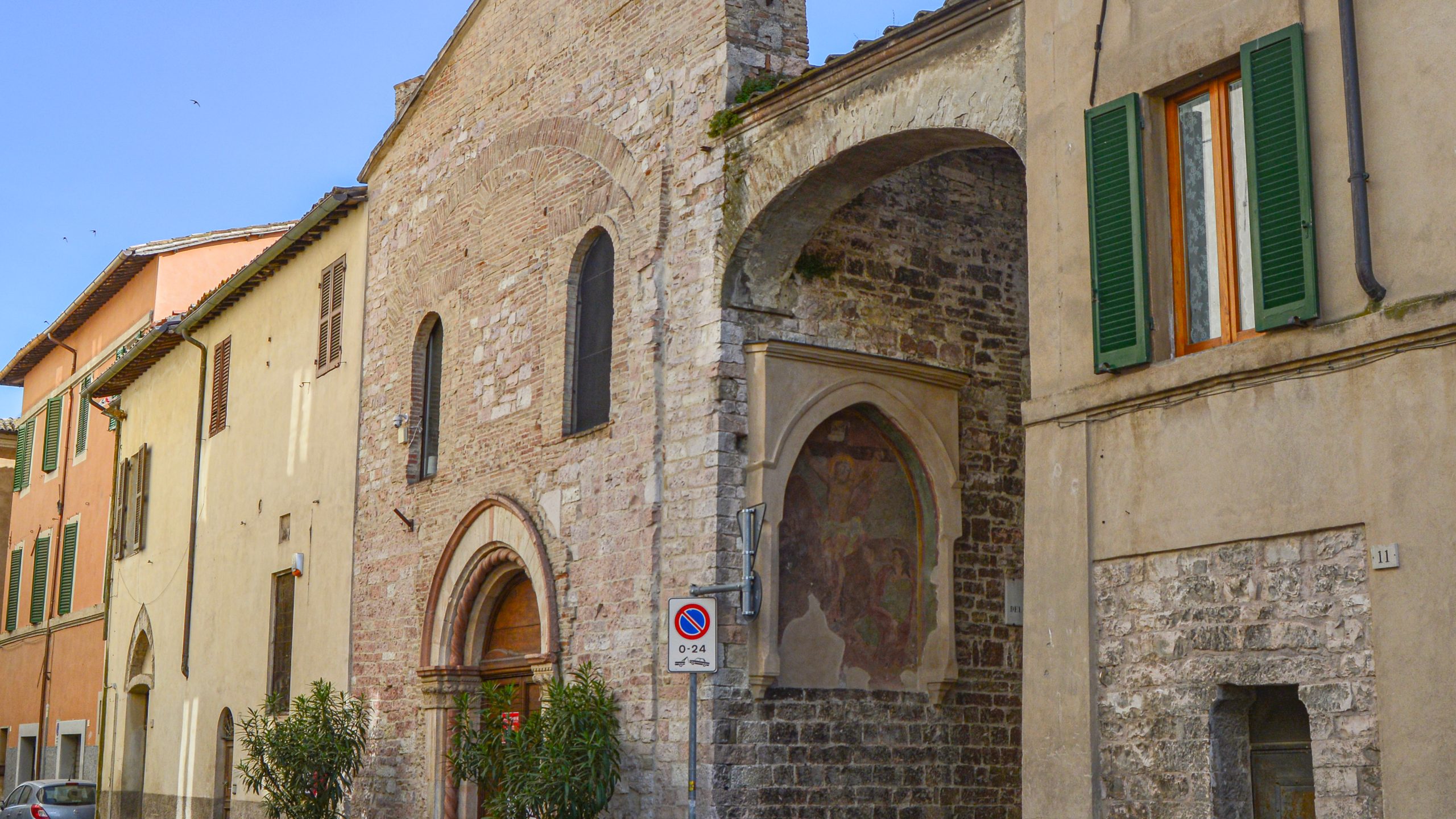 Così chiamata per la sua vicinanza al fiume Topino, fu edificata nella seconda metà del Trecento, anche se la chiesa è già menzionata nel 1239. Era originariamente a due navate, ma nel 1776 una fu trasformata nell’attuale chiesetta, mentre l’altra adibita a sacrestia, conservando però la primitiva struttura gotica con parte degli affreschi lungo le pareti. La facciata presenta due grossi finestroni ad arco che garantiscono l’illuminazione interna. Il portale molto raffinato nella sua decorazione presenta tre rincassi di cui quello centrale è costituito da una colonnina attorcigliata. I capitelli sono decorati con foglie di acanto e facce scolpite. All’interno era conservato un San Giovanni evangelista (1884) opera di Carlo Botti oggi nei magazzini della Diocesi insieme alle tele settecentesche che decoravano l’altare maggiore e una statua lignea di Sant’Apollonia attribuita ad Antonio Calcioni ora esposta in Vescovado. All’esterno, sulla parete che volge su via delle Ceneri, un’edicola con affresco del XV secolo. Oggi adibita al culto ortodosso.
