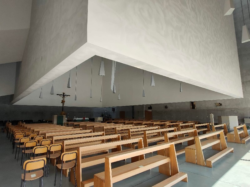 Dal punto di vista architettonico l’edificio di culto è costruito quasi interamente in cemento armato e si presenta come un vero e proprio cubo, il quale racchiude al suo interno un secondo parallelepipedo che inquadra altare e presbiterio. Un ricco sistema di punti luce, finestre e lampadari contribuisce a rendere la struttura assai suggestiva nonostante non siano mancate critiche riguardo lo stile “avveniristico” e inusuale per un edificio di culto.