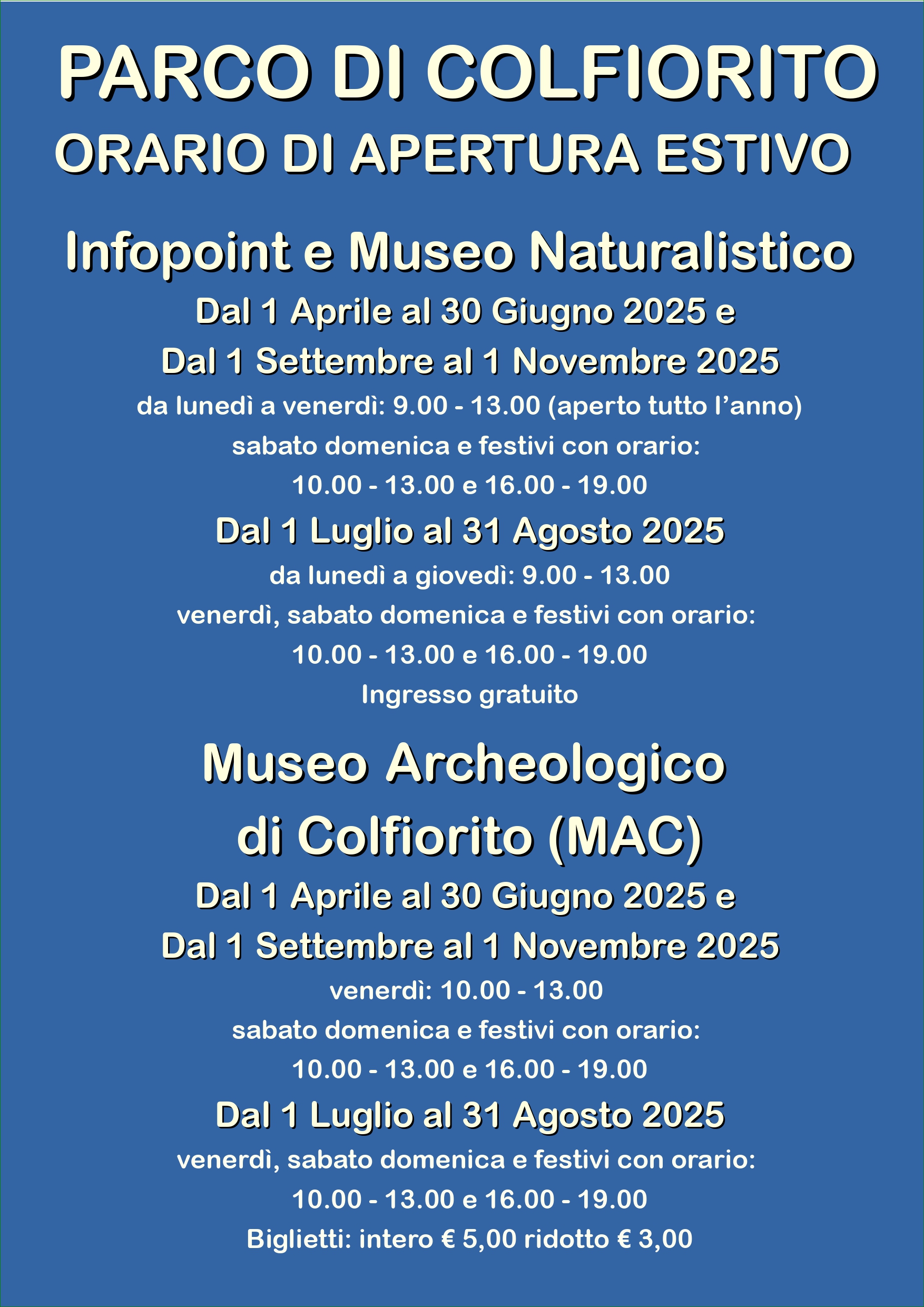 Orario Invernale di apertura al pubblico: