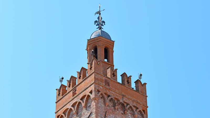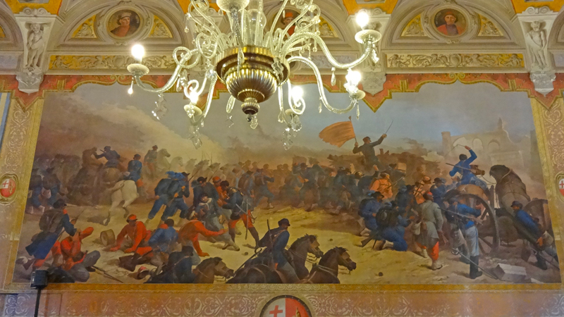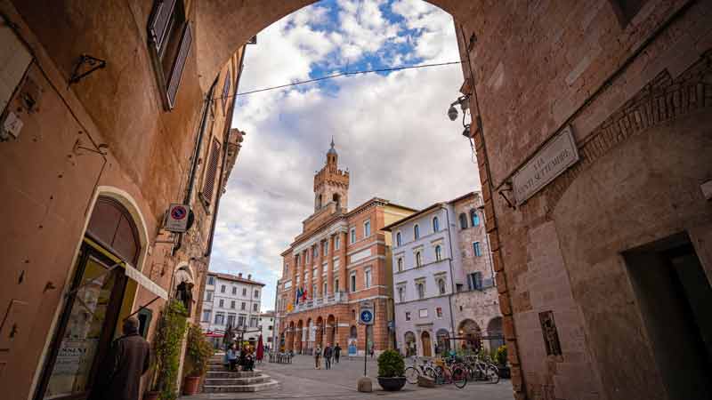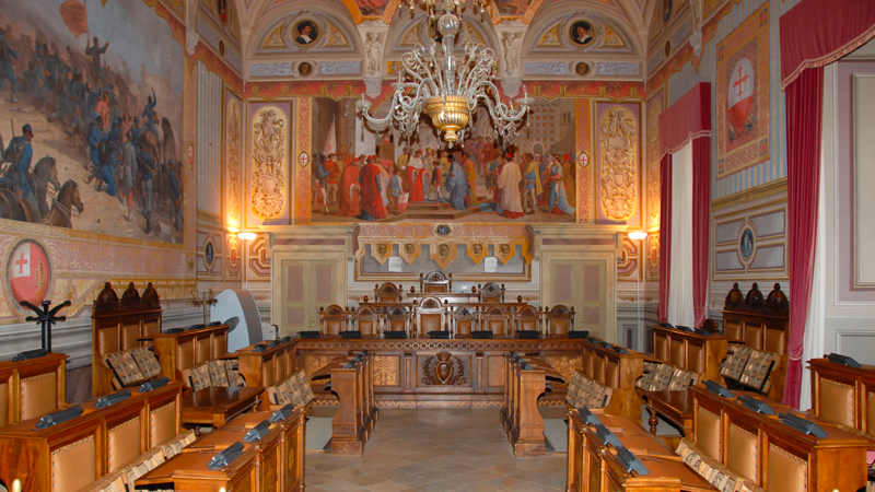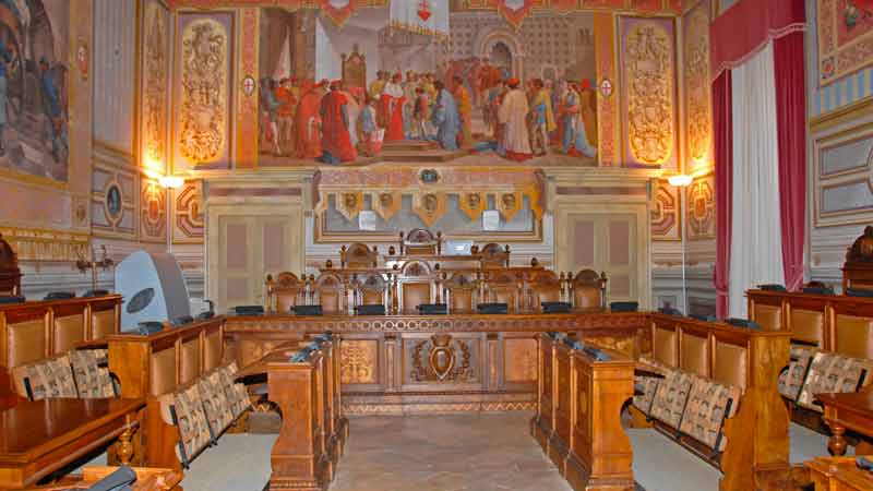 Il nucleo originale del palazzo risale al Duecento, ma venne completamente ricostruito tra la metà del Cinquecento e la metà del secolo seguente, quando vennero fusi i palazzi dei Priori e del Capitano del Popolo. Danneggiato dal terremoto del 1832, venne restaurato in stile neoclassico dall’architetto Antonio Mollari. Il “torrino”, distrutto dal terremoto del 1997, oggi si presenta, con i suoi 52 metri di altezza, integralmente restaurato. Salendo, nel mezzanino, possiamo ammirare l’affresco cinquecentesco della Madonna del Velo. Al primo piano, a fianco della porta di accesso all’attuale sala della Giunta, entro una finta architettura si trovano le immagini di san Feliciano, del beato Pietro Crisci e in alto lo Spirito Santo rappresentato da una colomba. La sala del Consiglio comunale è interamente decorata da Mariano Piervittori con le allegorie della Sapienza trionfante, della Forza, della Prudenza e della Giustizia, le allegorie di arti, scienze e tecniche e la raffigurazione di sedici folignati illustri. Alle pareti tre grandi quadri storici: L’arrivo di Federico II giovinetto a Foligno, Il folignate conte Robbacastelli respinge l’esercito di Federico I Barbarossa e La morte di Colomba Antonietti. Le due pareti longitudinali presentano quattro tondi che alludono al viaggio dantesco nell’aldilà richiamando la prima edizione della Divina Commedia stampata a Foligno l’11 aprile 1472. Notevoli anche la Sala dei Paesaggi, la Sala delle armi con le pareti decorate con gli stemmi delle famiglie nobili di Foligno e la Sala delle arti e dei mestieri, attuale studio del sindaco.