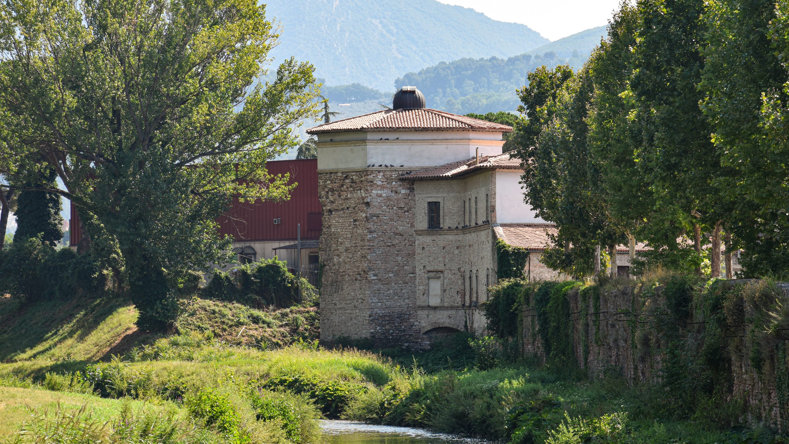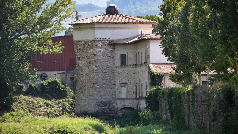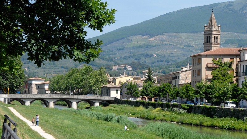 Si trova a ridosso del fiume Topino, la Torre dei Cinque Cantoni, così chiamata per la particolare forma geometrica, dalla quale si possono osservare sia i cormorani che sostano sui platani, che i corpi celesti, grazie all’installazione di un osservatorio astronomico avvenuta in anni recenti. La costruzione fu eretta a difesa delle mura volute dall’imperatore Federico II e oggi rappresenta l’elemento architettonico distintivo di questo spazio. Il seicentesco Orto Jacobilli si estende per oltre due mila metri quadrati all’interno di un perimetro costituito da murature di mattoni e ciottoli e da un tratto delle mura urbiche facilmente riconoscibili per la presenza di feritoie e di una torretta. Il terrazzino che si affaccia oltre il portale, che è ben visibile tra i tratti di muro, consente di scorgere il fossato medievale.
