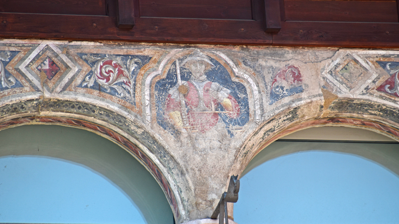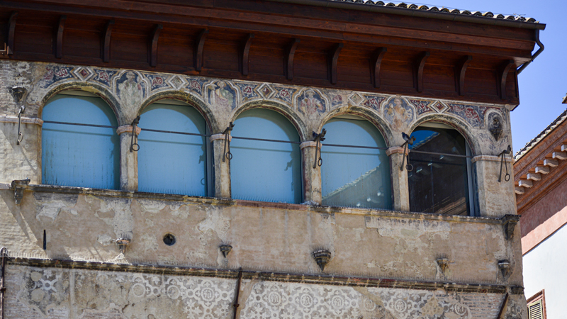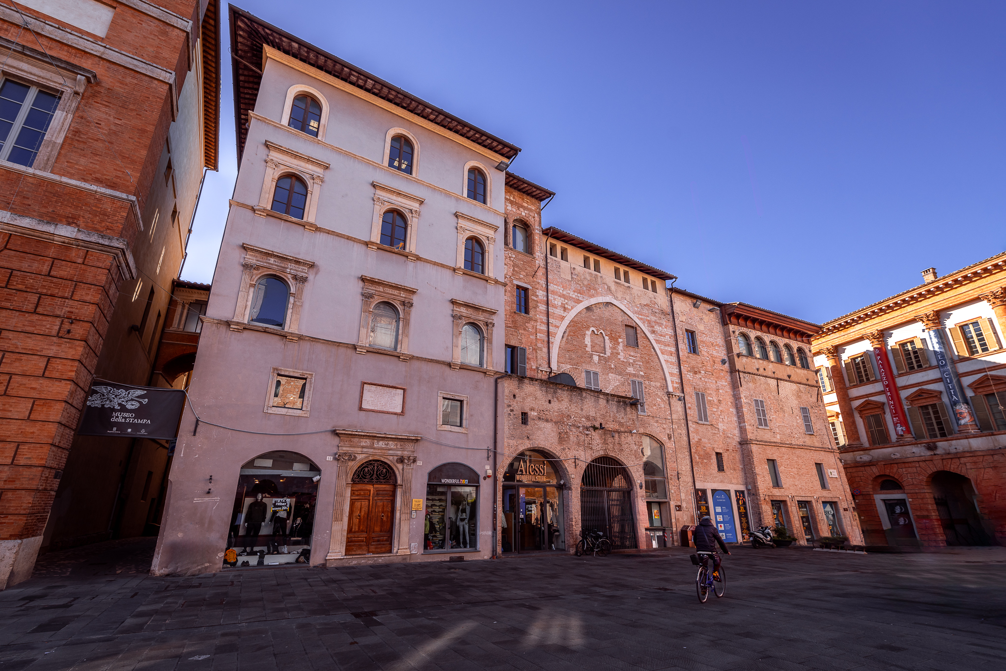 Caratterizzato dall’elegante loggiato costruito nel Duecento, è stato sicuramente ristrutturato dalla famiglia Trinci di cui reca la cifra in un arazzo dipinto sull’esterno. Era collegato a palazzo Trinci tramite un ponte, demolito dopo essere stato acquistato dagli Orfini nel 1758, già da tempo proprietari (1599) del palazzetto podestarile. La decorazione della facciata è costituita dalla raffigurazione, attribuita a Giovanni Corraduccio detto Mazzaforte, delle Virtù cardinali che devono sovrintendere all’esercizio del potere politico. La decorazione interna della loggia è interamente a monocromo secondo un gusto molto diffuso nella Foligno dell’epoca e rappresenta sulla parete lunga le Virtù teologali assise sopra le mura di una città, mentre sulle altre pareti una complessa composizione che forse allude alla mitica fondazione della città da parte di Tros, capostipite della famiglia Trinci fuggito da Troia in fiamme. La figura femminile sarebbe Flamminea, simbolo della città.