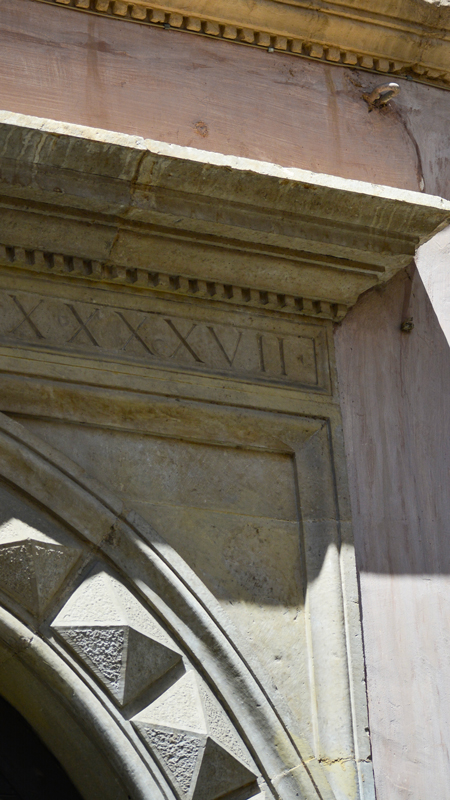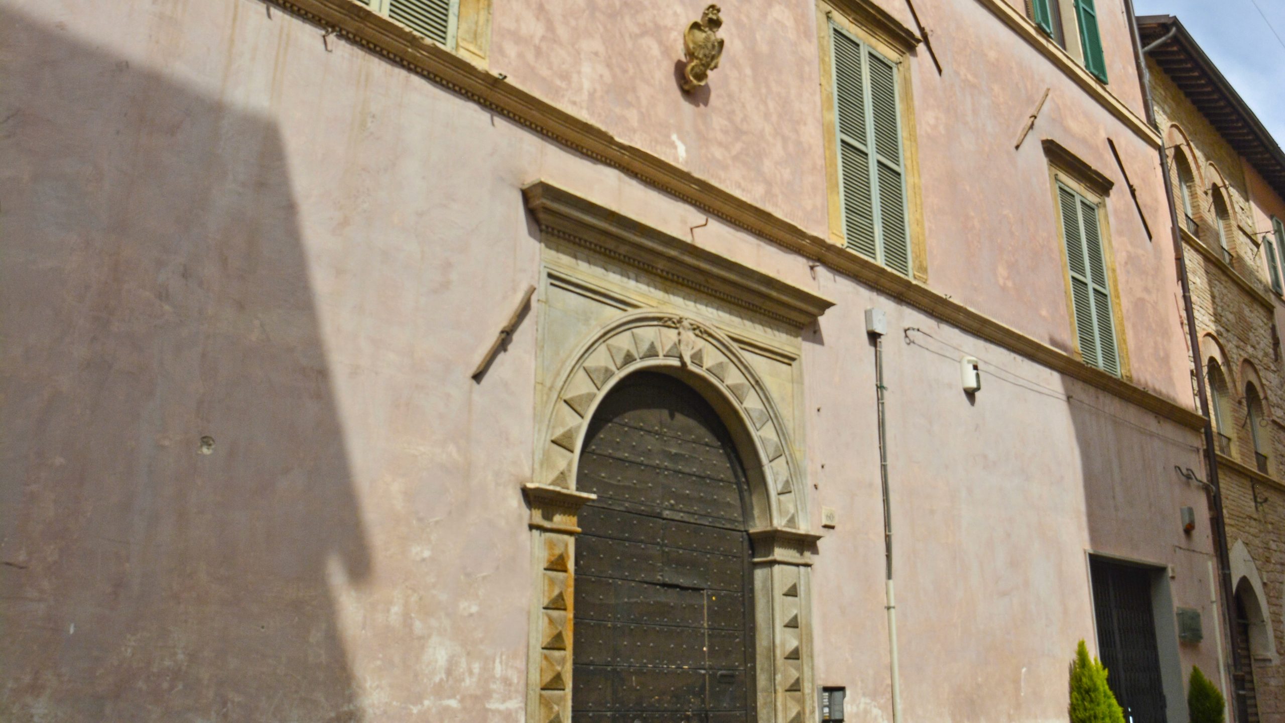 Costruzione tardo quattrocentesca, già residenza del casato di Luca Borsciani (1490-1522), vescovo di Foligno cui Innocenzo VIII Cibo accordò il privilegio di aggiungere al proprio cognome quello dei Cibo e di fregiarsi del relativo stemma, è stato poi acquistato nel 1745 dalla famiglia Nocchi. Di notevole fattura il portale incorniciato da bugne a punta di diamante. L’architrave riporta motivi classicheggianti caratterizzati da cornici e dentelli; al centro è inserito uno stemma con il monogramma di San Bernardino. Sulla trave è incisa per tutta la sua lunghezza l’invocazione a Dio e la data di realizzazione (1497). Nella parte sottostante, su di uno scudo a forma di testa di cavallo, la chiave di volta dell’arco riporta uno stemma con un altro monogramma di San Bernardino. Le due facciate del palazzo sono divise in tre ordini da semplici cornici marcapiano. Le finestre sono di due tipologie: quelle del piano nobile sono in pietra caciolfa scolpita secondo i canoni rinascimentali, le altre dell’ordine superiore presentano una semplice modanatura in mattoni. Audio