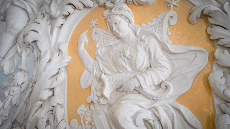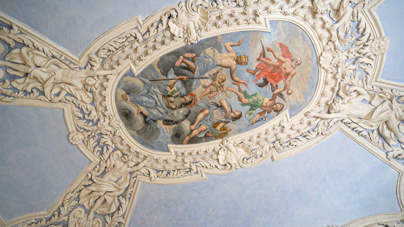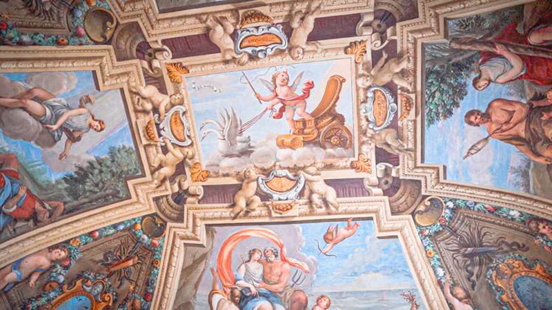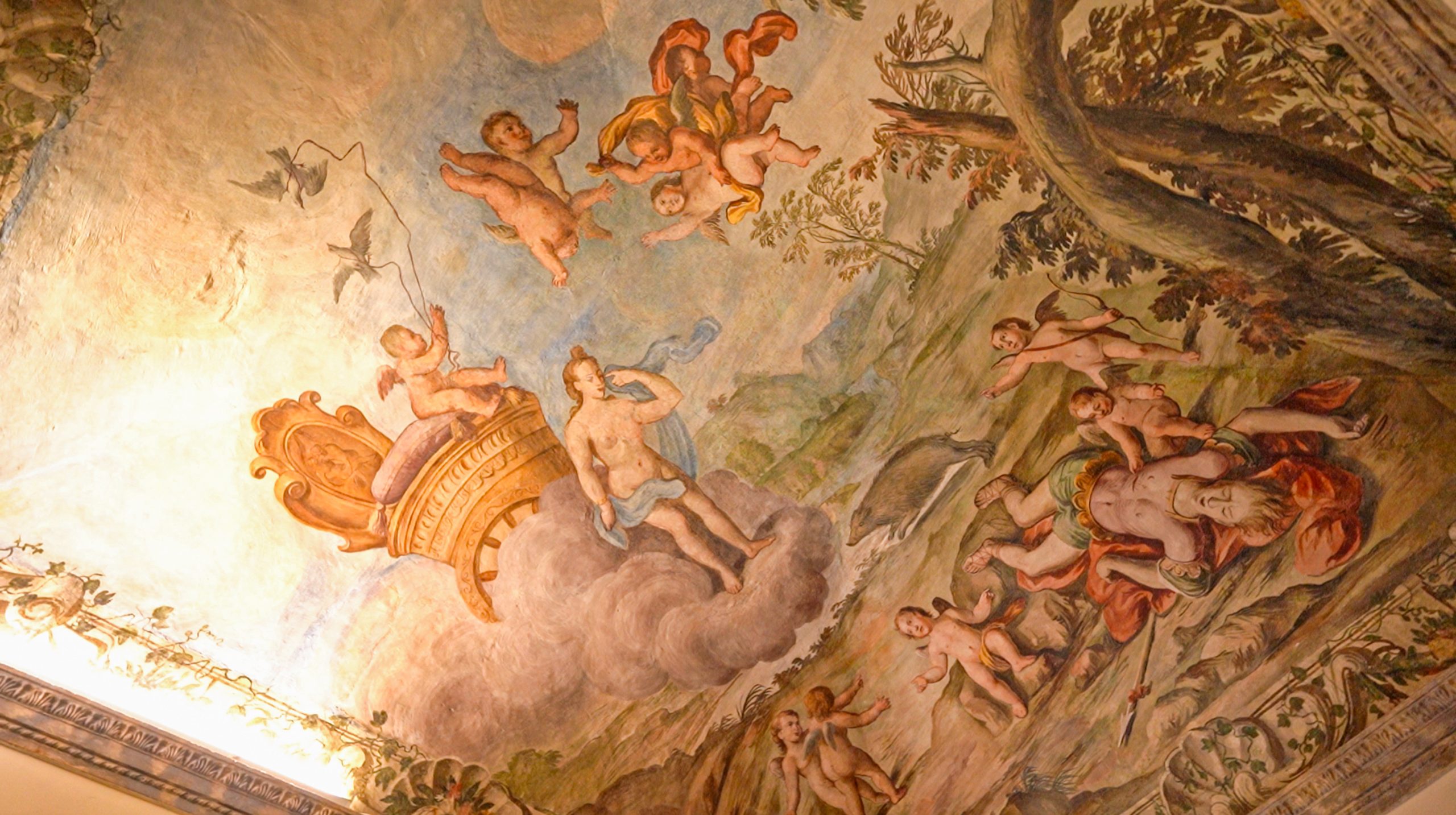 Trae origine dalla fusione di due preesistenti abitazioni con annessi spazi verdi, l’una di proprietà degli Angelelli, poi acquistata nel 1660 dai Pierantoni, e l’altra appartenente a un ramo degli Orfini e acquisita in seguito congiuntamente dai Pierantoni e dai Polinori nel 1688. Dal 1879 al 1981 è stato monastero delle Agostiniane. L’attuale edificio conserva consistenti elementi della ridefinizione strutturale realizzata tra Cinque e Settecento. Al piano nobile tre ambienti presentano volte dipinte: la Sala dell’Olimpo, la Sala di Cupido e la Sala di Apollo. Nel salone di rappresentanza, privo di pitture, un bel camino a stucco con lo stemma dei Ravenstein, parenti dei Pierantoni. Nella Sala dell’Amore Cupido sta al centro e sferza i cigni che trasportano il cocchio, nell’impazienza di andare a colpire con i suoi dardi dei e mortali: “Amore nihil immune”, chiarisce l’iscrizione. La volta affrescata è attribuita a Giovan Battista Michelini (Foligno 1604-1679). Oggi è adibito a ostello della gioventù.
