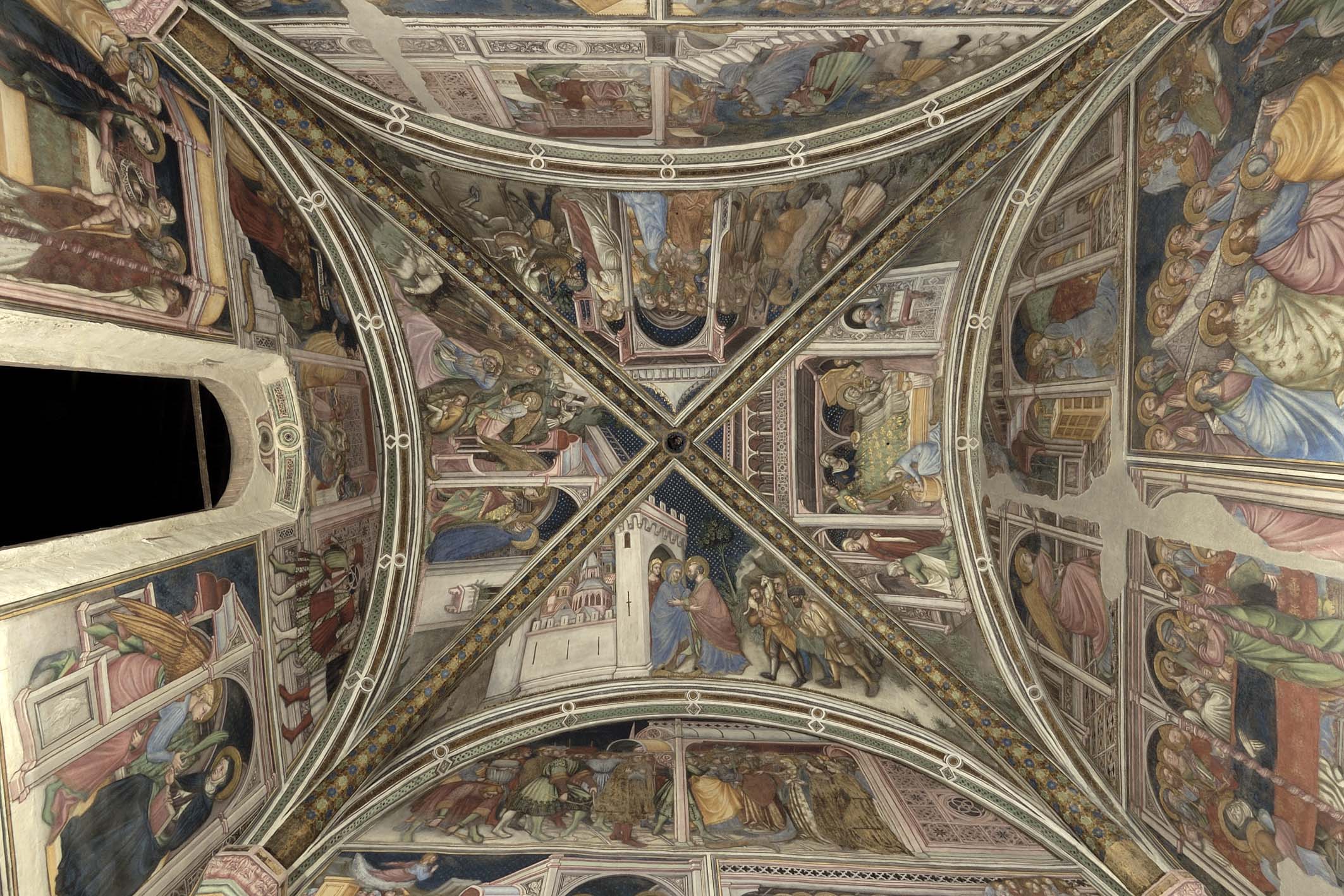 Le récit commence dans les voiles, où l'on reconnaît la naissance de Marie. Il se poursuit comme une spirale dans les lunettes, où l'on peut voir la scène du mariage de la Vierge et l'annonce de la naissance de Jésus. Au-dessus de l'autel, les épisodes de la naissance de Jésus et de l'Adoration des mages. L'histoire se termine par la mort (Dormition) puis l'Assomption au ciel de Marie. Derrière l'autel entourent la Crucifixion les Saints proches de la famille, dont Saint Feliciano, patron de Foligno, et Saint François d'Assise recevant les Stigmates.