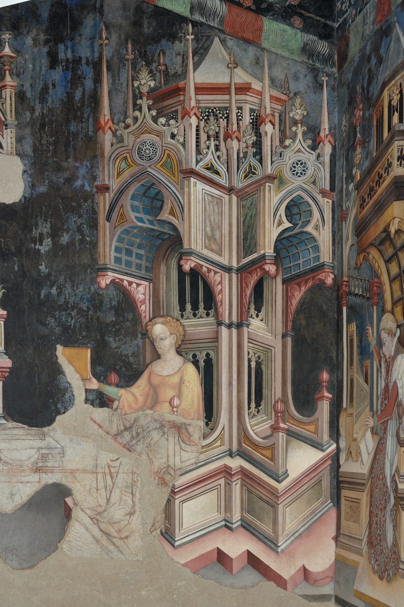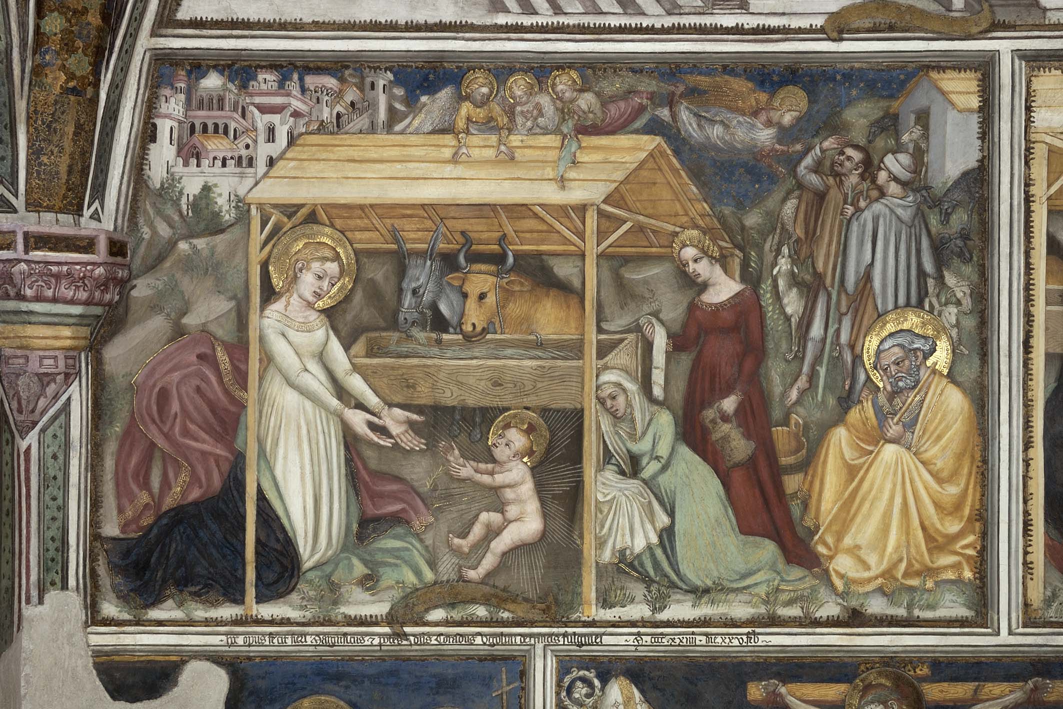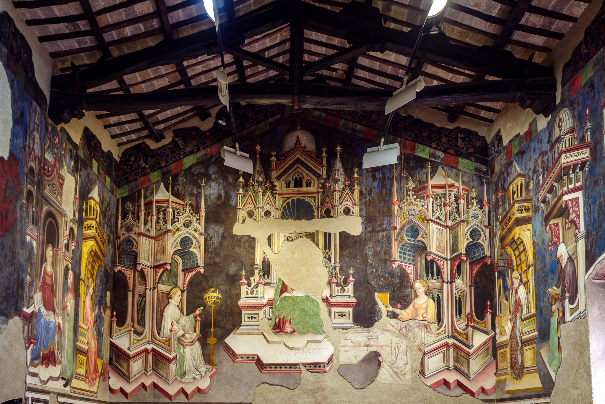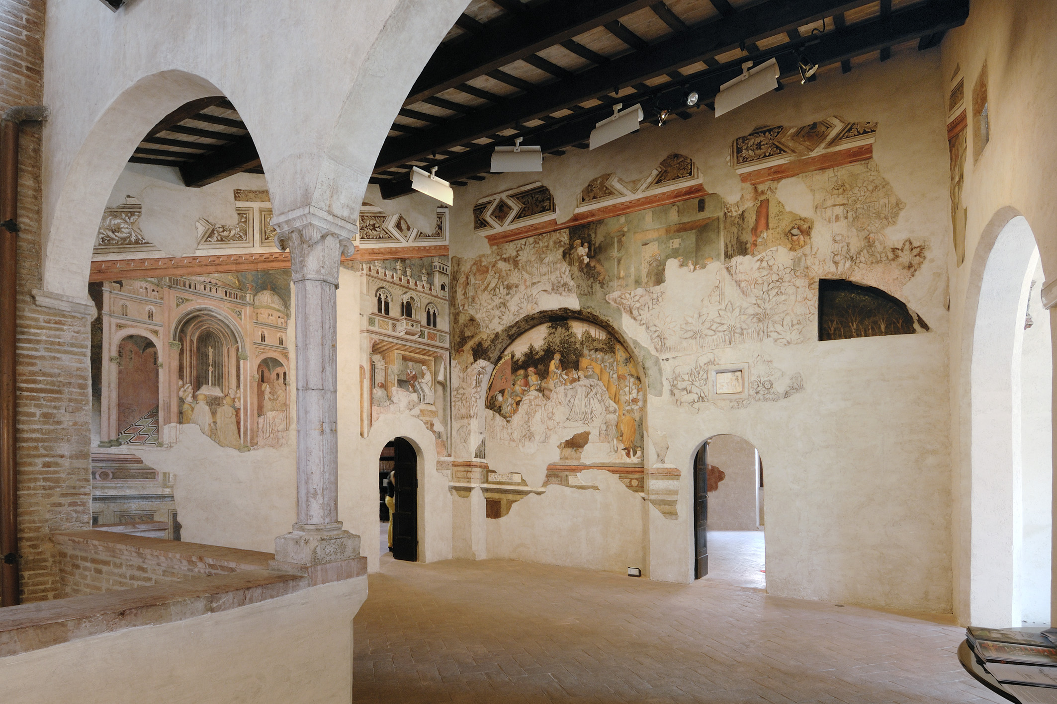 Tornando nella Loggia e salendo tre gradini si incontra la Cappella affrescata da Ottaviano Nelli, con Storie della vita della Vergine, datata 1424.