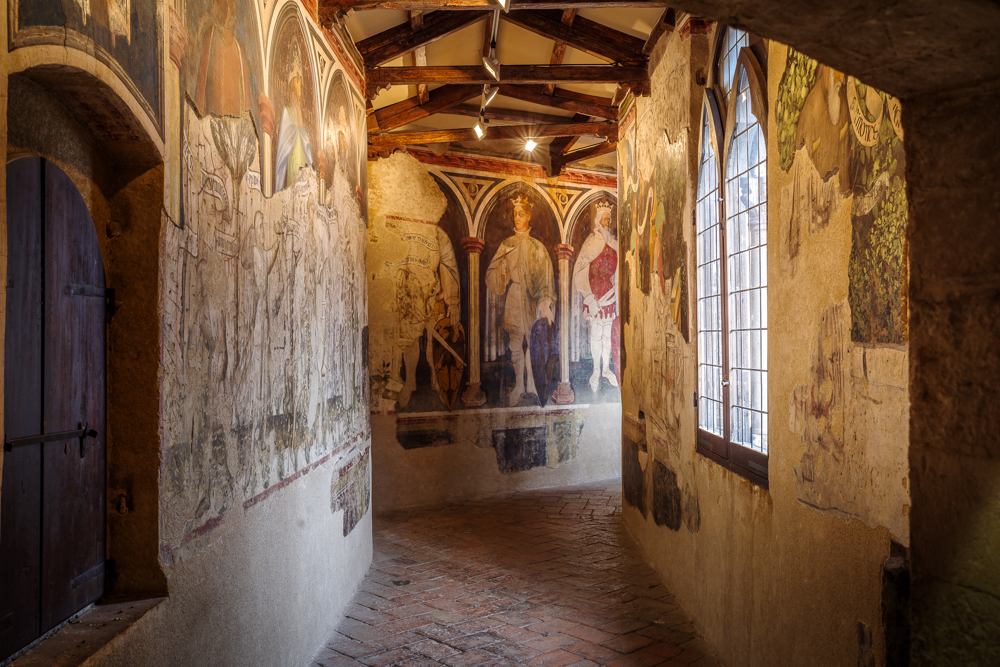 Le corridor est un "pont suspendu" qui relie le palais à la cathédrale de San Feliciano. Les figures fragmentaires de onze héros de l'Antiquité (Josué, David, Judas Maccabée, Hector, Jules César, Alexandre le Grand, le roi Arthur, Charle le Grand, Godefroy de Bouillon, Romulus, Scipion Africanus), représentées sur le mur nord, et les sept âges de l'homme représentés sur le mur opposé, sont également l'œuvre de Gentile Da Fabriano et de ses collaborateurs. Visible sur le serti sous le plâtre, une fresque monochrome se référant à la décoration précédente, avec le même thème de l'Âge de l'Homme de l'école de peinture de Foligno datèè du dèbut du XVe siècle.