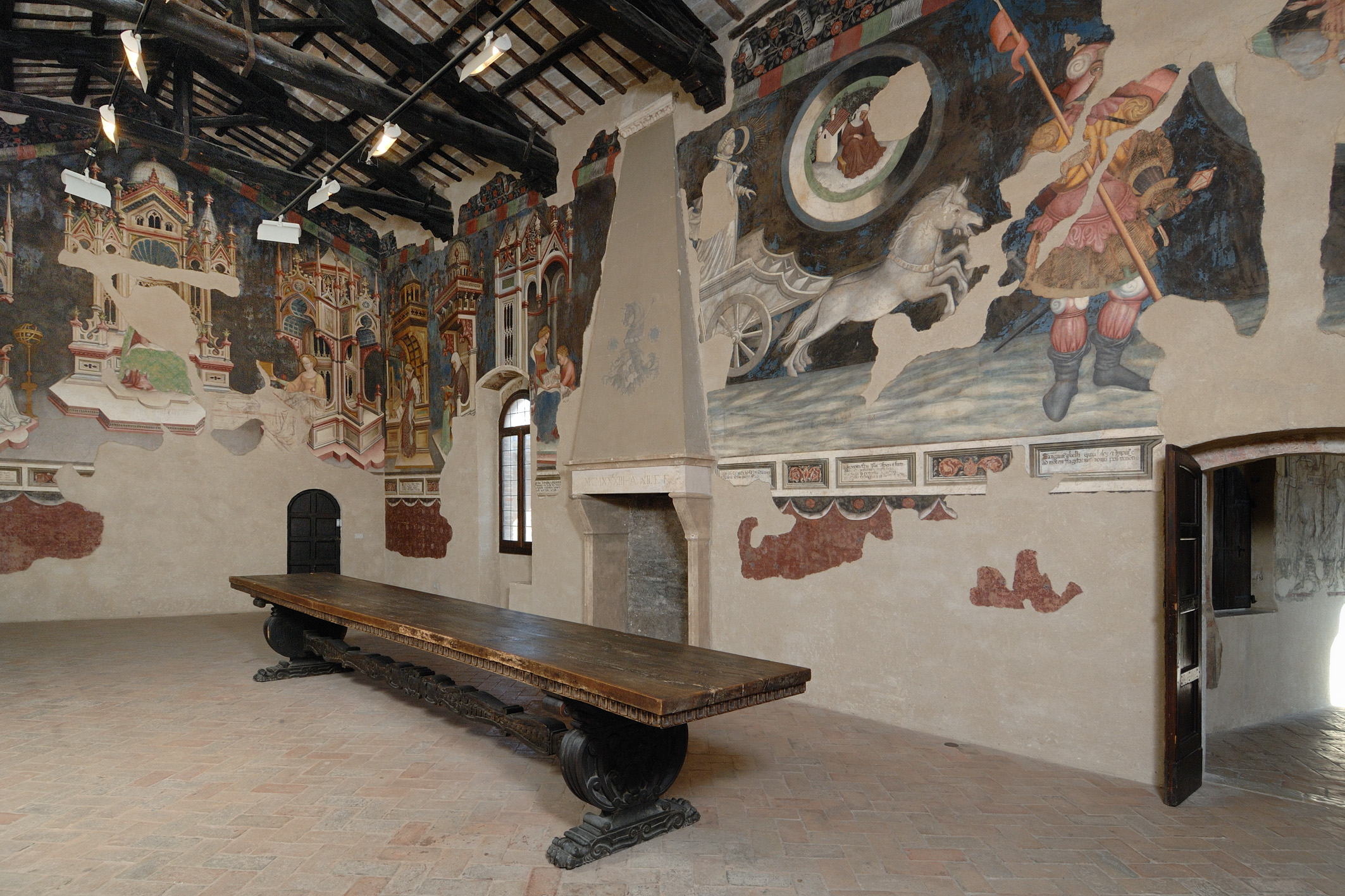Lorsque, dans la première décennie du XVe siècle, les Trinci voulurent donner un signe tangible de leur prestige dans la représentation du nouveau, ils reprirent cet étrange discours des étoiles qui sont l'idée de l'espace et définissent par leurs mouvements la tournure du temps. Dans la Salle des Arts et des Planètes, les figures symboliques des sept planètes - Lune, Mars, Mercure, Jupiter, Vénus, Saturne, Soleil - étaient représentées, en suivant l'ordre des jours de la semaine. Chaque planète supervise une phase de la vie humaine qui est représentée à l'intérieur de disques concentriques où, dans la zone centrale, l'Air, le Soleil et la Lune définissent un moment précis de la journée.