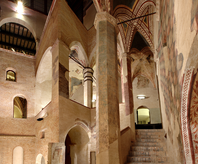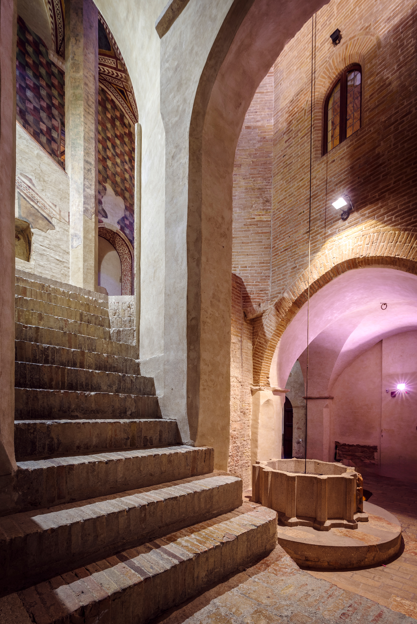 Autour de l’escalier, qui au rez-de-chaussée conserve encore un puits désaffecté, tourne l’ensemble du complexe architectural avec le but de relier les parties plus ancienne du bâtiment des formes encore romaines avec celles bâties ex-novo déjà marquées au goût gothique.