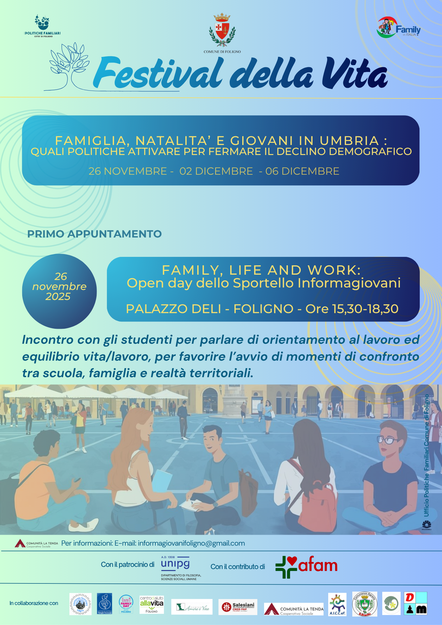 Open day dello sportello Informagiovani sul tema: Family, Life and Work. Si tratta di una attività rivolta alle classi del triennio delle scuole secondarie di secondo grado, con l’obiettivo di fornire strumenti concreti, stimolare la partecipazione attiva degli studenti e consolidare competenze trasversali trattando temi quali percorsi di orientamento al lavoro e studio integrato con equilibrio vita/lavoro, favorendo l’avvio di momenti di confronto tra scuola, famiglia e realtà territoriali.