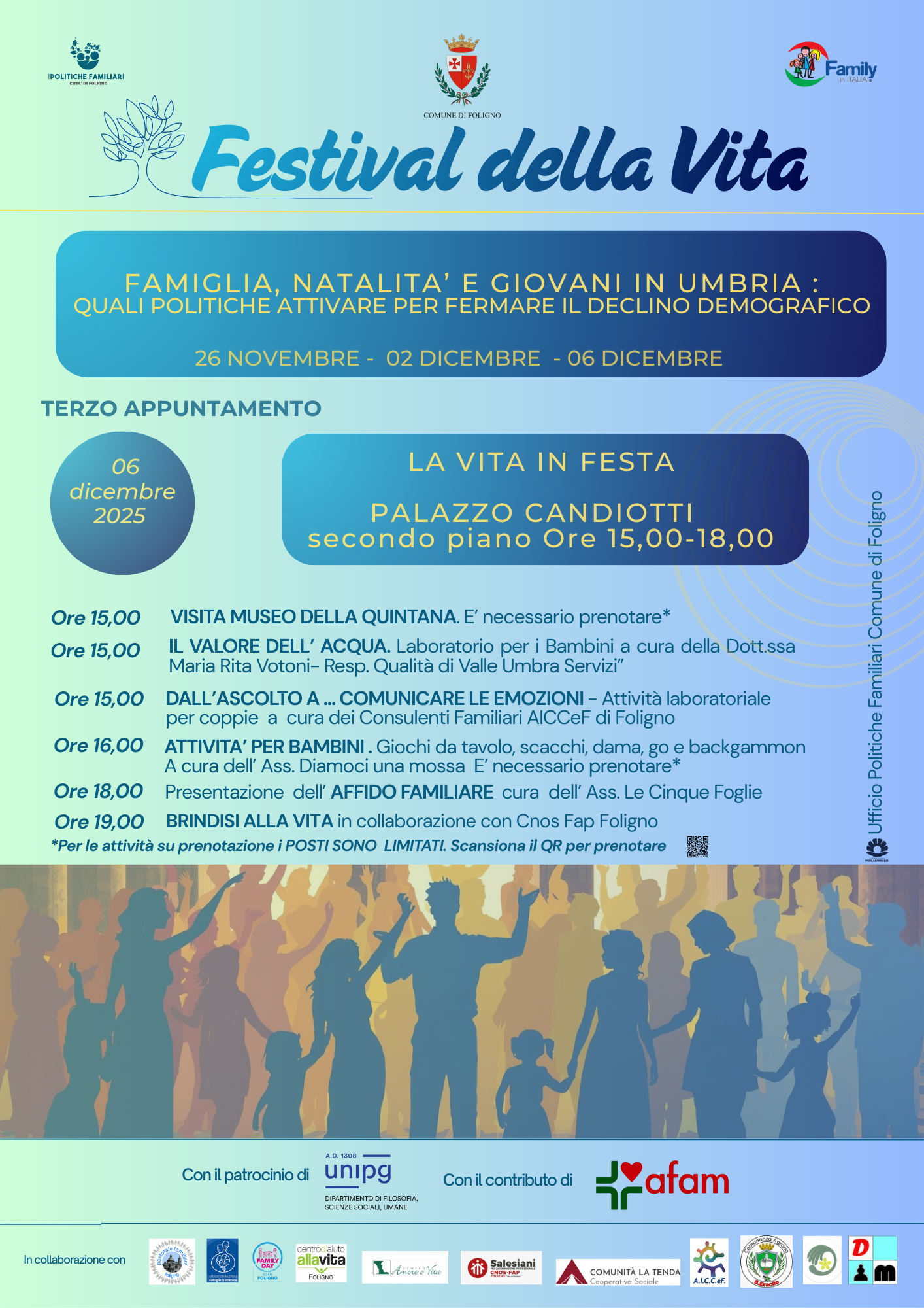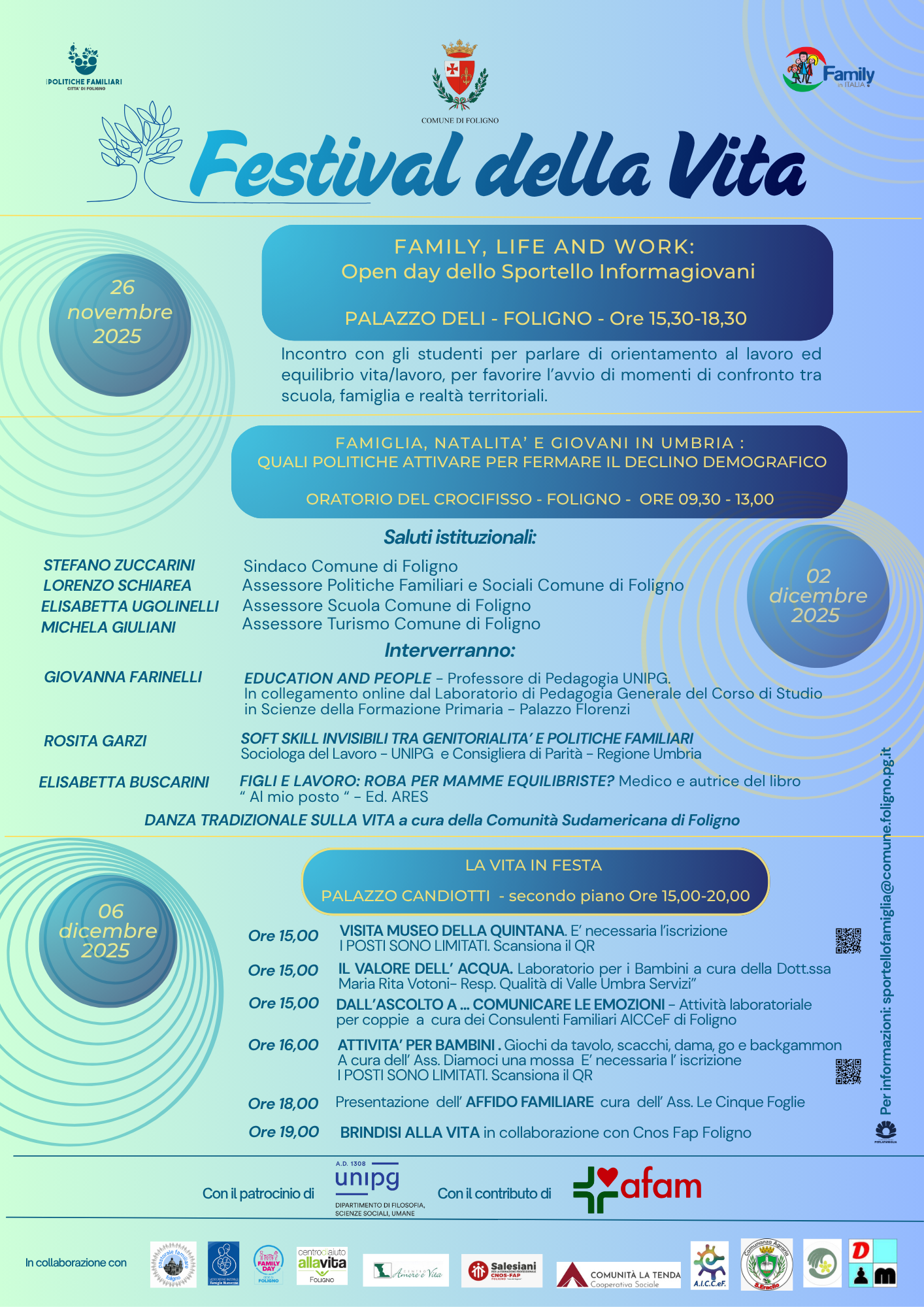 Il Festival della Vita, giunto alla terza edizione, si pone l’obiettivo di offrire uno spazio di riflessione e soluzioni concrete per affrontare la crisi demografica che affligge l'Umbria e l'Italia, parlando della vita nella sua espressione più alta: la famiglia, la natalità e il futuro dei giovani.