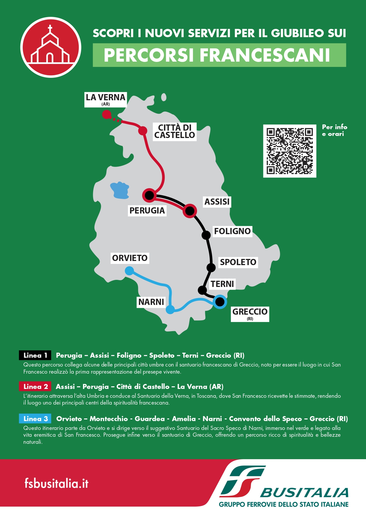 In occasione del Giubileo 2025 e delle celebrazioni per l’800° anniversario della morte di San Francesco d’Assisi, la Regione Umbria ha promosso la creazione di tre linee Gran Turismo dedicate ai pellegrini per favorire la mobilità e l’accessibilità verso i luoghi simbolo della spiritualità francescana.