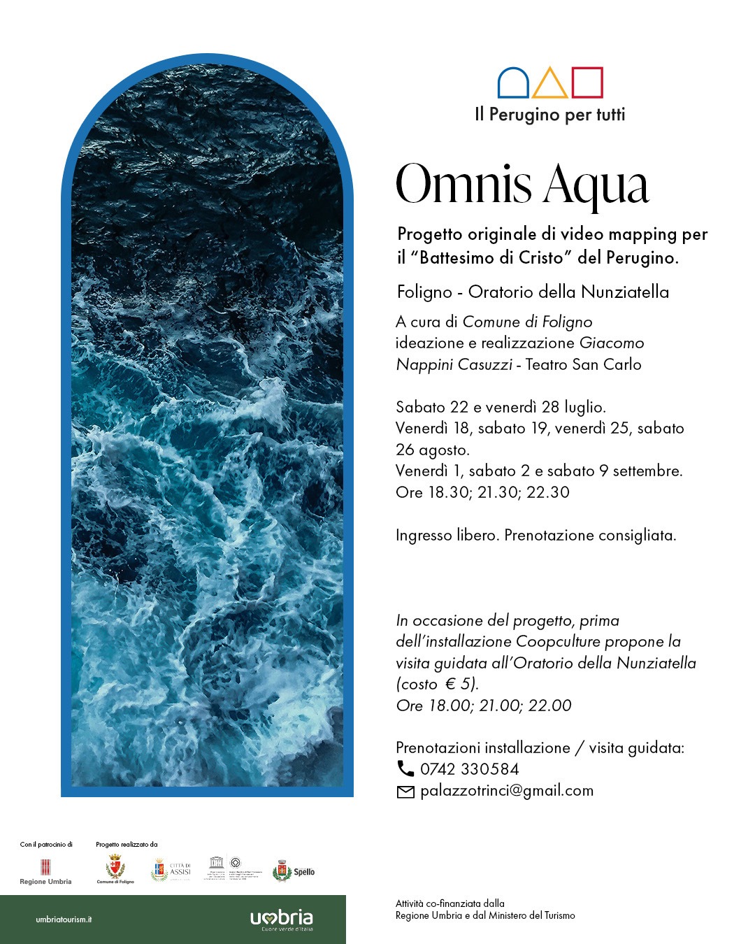Un video mapping “Omnis Aqua” per valorizzare al meglio l’affresco del Perugino “Il Battesimo di Cristo” all’Oratorio della Nunziatella: è l’evento promosso domani, sabato 22 luglio, a Foligno, nell’ambito delle iniziative del progetto “Il Perugino per tutti” che interessa i Comuni di Foligno, Assisi e Spello.