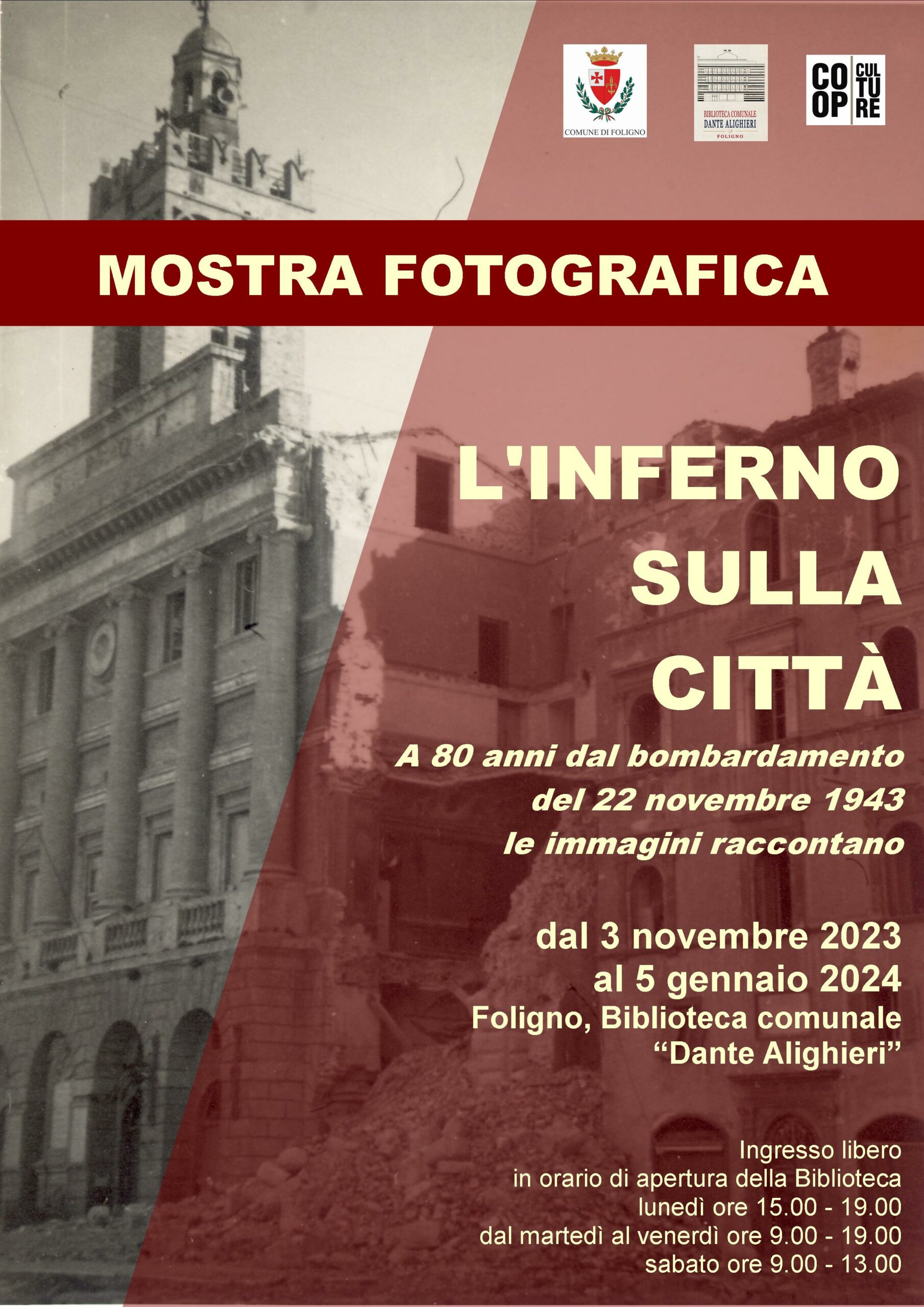 La mostra fotografica "L'inferno sulla città. A 80 anni dai bombardamenti del 22 novembre 1943 le immagini raccontano", allestita presso la Biblioteca comunale di Foligno dal 3 novembre 2023, è stata prorogata fino al 5 gennaio 2024.