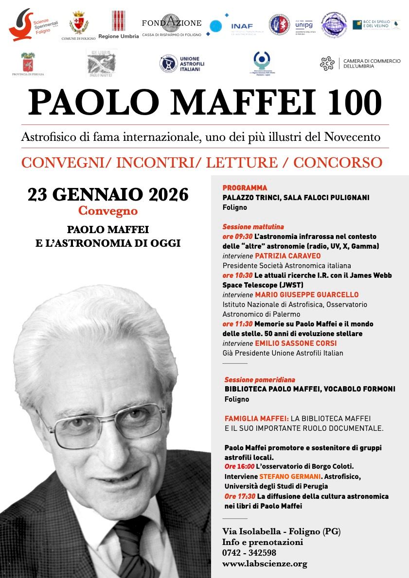 Considerato una delle figure più autorevoli dell’astrofisica del Novecento, Maffei è stato docente universitario, scienziato visionario e autore di opere che hanno segnato la storia della divulgazione scientifica in Italia. Per rendere omaggio alla sua eredità scientifica e culturale, il Laboratorio di Scienze Sperimentali di Foligno promuove un percorso di convegni, incontri e letture da dicembre 2025 a maggio 2026 dal titolo “Paolo Maffei: Cento anni di visione scientifica e attività divulgativa”.