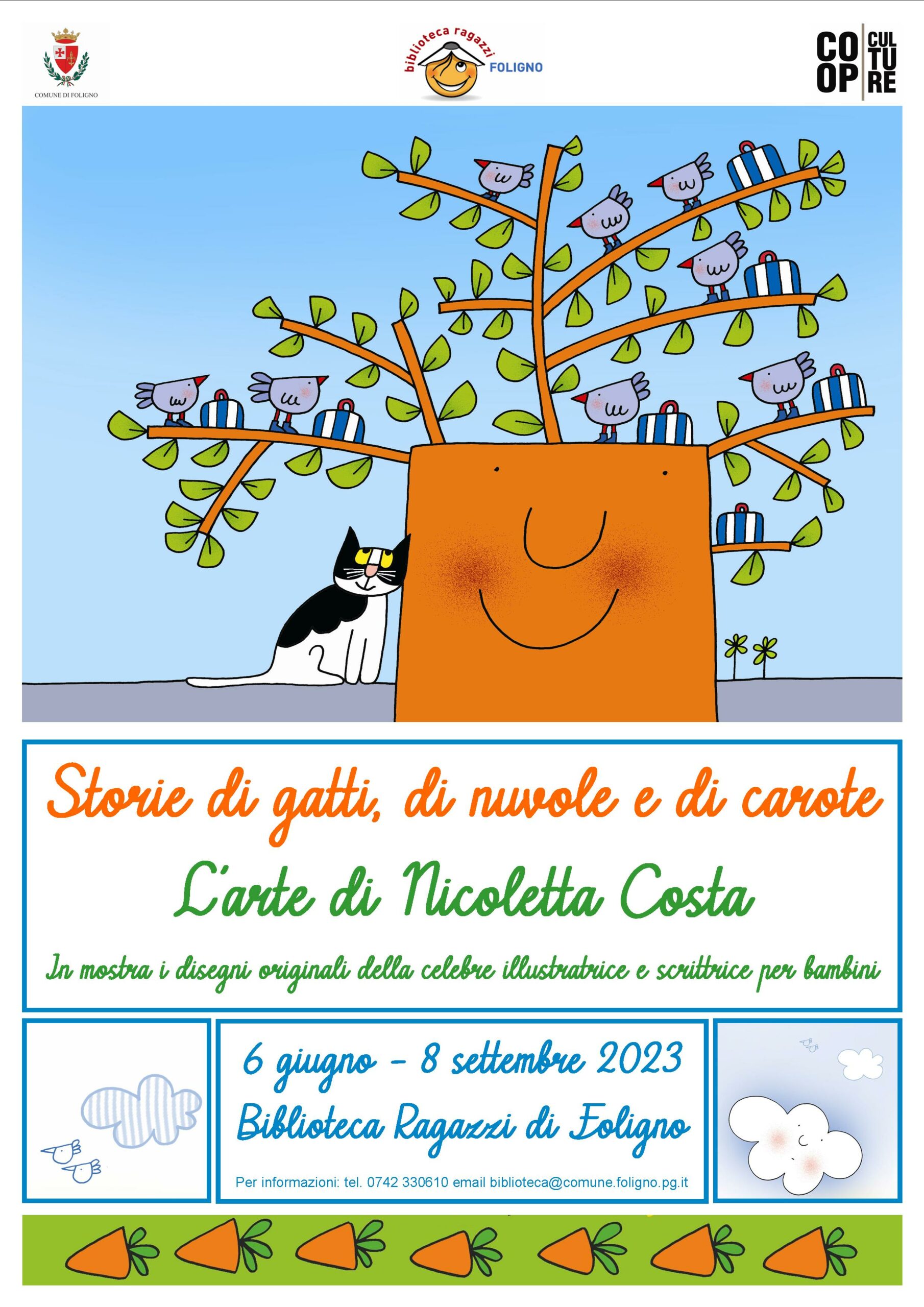 Il 6 giugno alle 17.30 sarà inaugurata la mostra “Storie di gatti, di nuvole e di carote. L’arte di Nicoletta Costa” a Foligno, in Biblioteca ragazzi, con una piccola sezione anche in Biblioteca centrale. L’esposizione raccoglie oltre 40 disegni originali della nota illustratrice e scrittrice per l’infanzia Nicoletta Costa, creatrice di personaggi amatissimi dai bambini come Giulio Coniglio, Nuvola Olga e tanti altri. La mostra seleziona e racconta l’evoluzione artistica dell’illustratrice, che ha pubblicato più di 600 albi illustrati in tutto il mondo, in una carrellata che va dai primi lavori fino alle illustrazioni più recenti.
