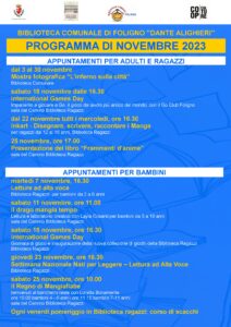 La biblioteca di Foligno "Dante Alighieri" accoglie i cittadini con i suoi servizi pubblici e gratuiti di prestito di libri, aiuto nella ricerca di documenti, sala di lettura, eventi culturali e di promozione della lettura per bambini e per adulti.