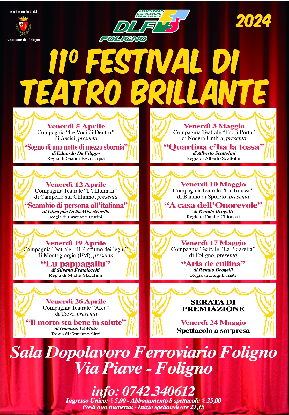 XI edizione del Festival di Teatro Brillante, che porterà in scena sette diverse Compagnie teatrali dell’Umbria. Il Festival, organizzato dal Dopolavoro Ferroviario di Foligno nel Salone della propria sede, in Via Piave 2/A, con il contributo del Comune di Foligno.