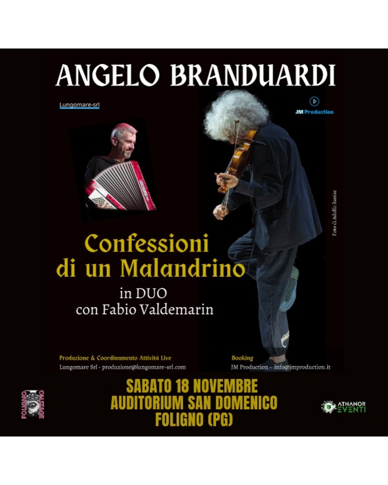 “Confessioni di un malandrino” Angelo Branduardi presenta una versione particolare dei suoi brani più celebri, in duo col polistrumentista Fabio Valdemarin, suo compagno di viaggio da ormai molti anni. L’esibizione si basa sul violino e la chitarra di Angelo e sulla “piccola orchestra” di Fabio che, oltre al pianoforte a coda, suonerà chitarre e fisarmonica. Verranno eseguiti brani che si rifanno alla musica del periodo classico più arcaico e che fanno parte della raccolta “Futuro antico” che conta ben otto episodi. Non mancheranno i brani più celebri legati alla carriera di Angelo ma accanto a questi si potranno riascoltare alcune delle sue composizioni più rare, meno eseguite ma non per questo dimenticate o meno amate.