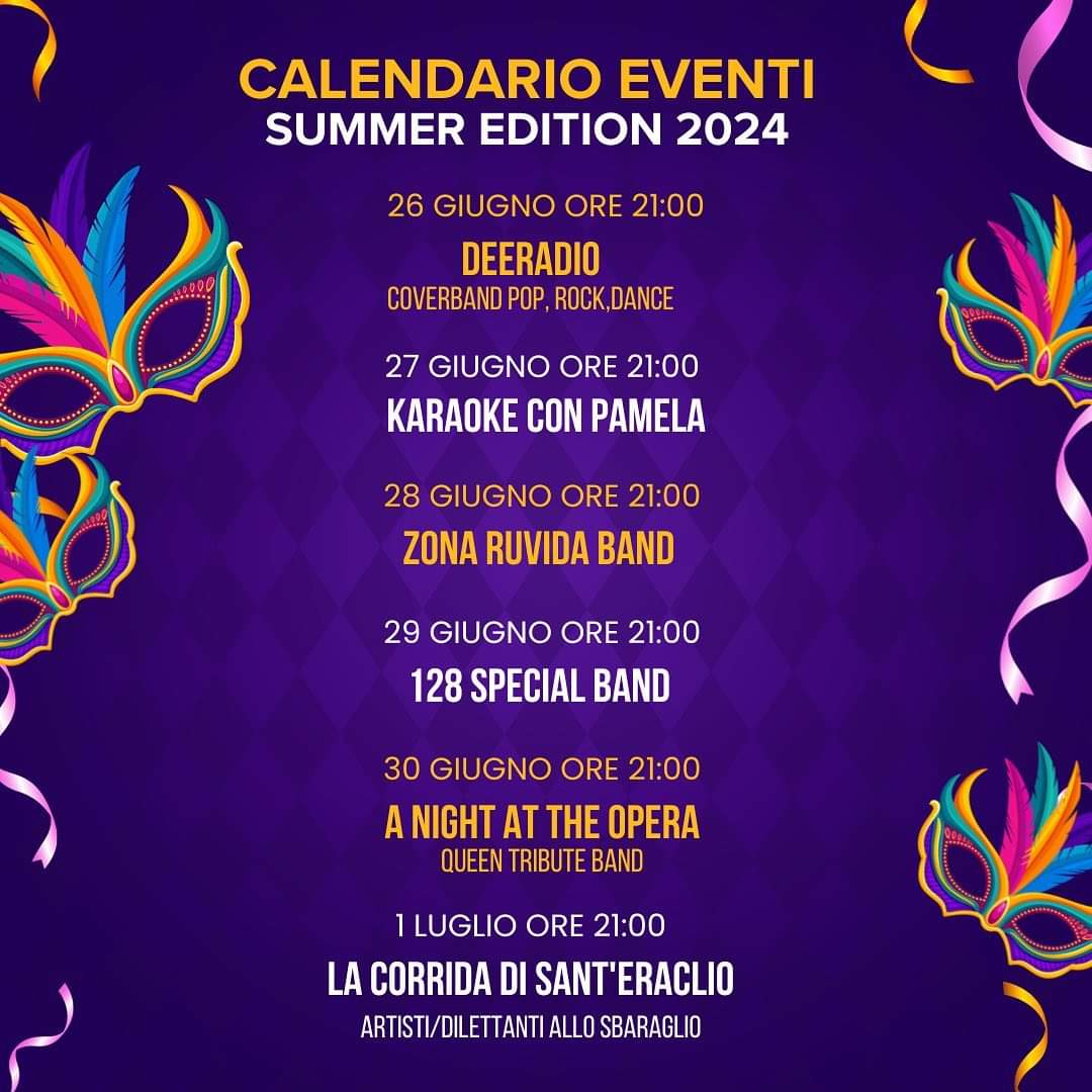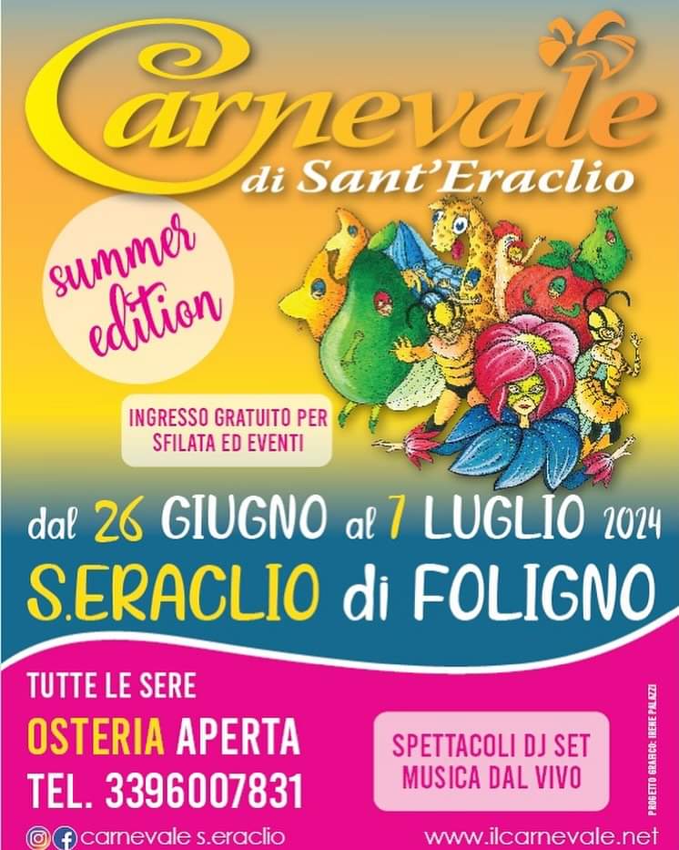Dal 26 giugno al 7 luglio, il Carnevale Estivo di Sant’Eraclio promette serate indimenticabili con eventi gratuiti per tutta la famiglia. Ogni sera, dalle 20:00 in poi, potrete godere di spettacoli, musica e intrattenimento.