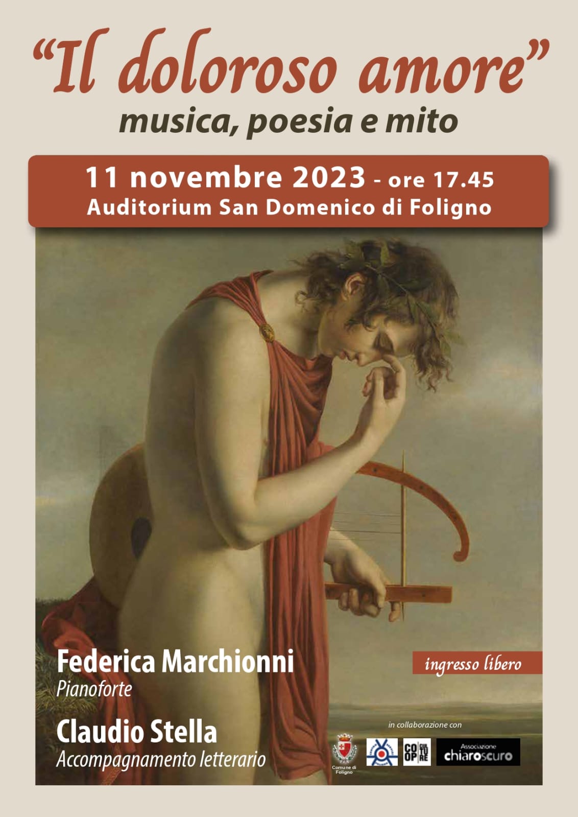 Cos'è Il doloroso amore: musica, poesia e mito, con Federica Marchionni al pianoforte e Claudio Stella accompagnamento letterario. Ingresso libero.