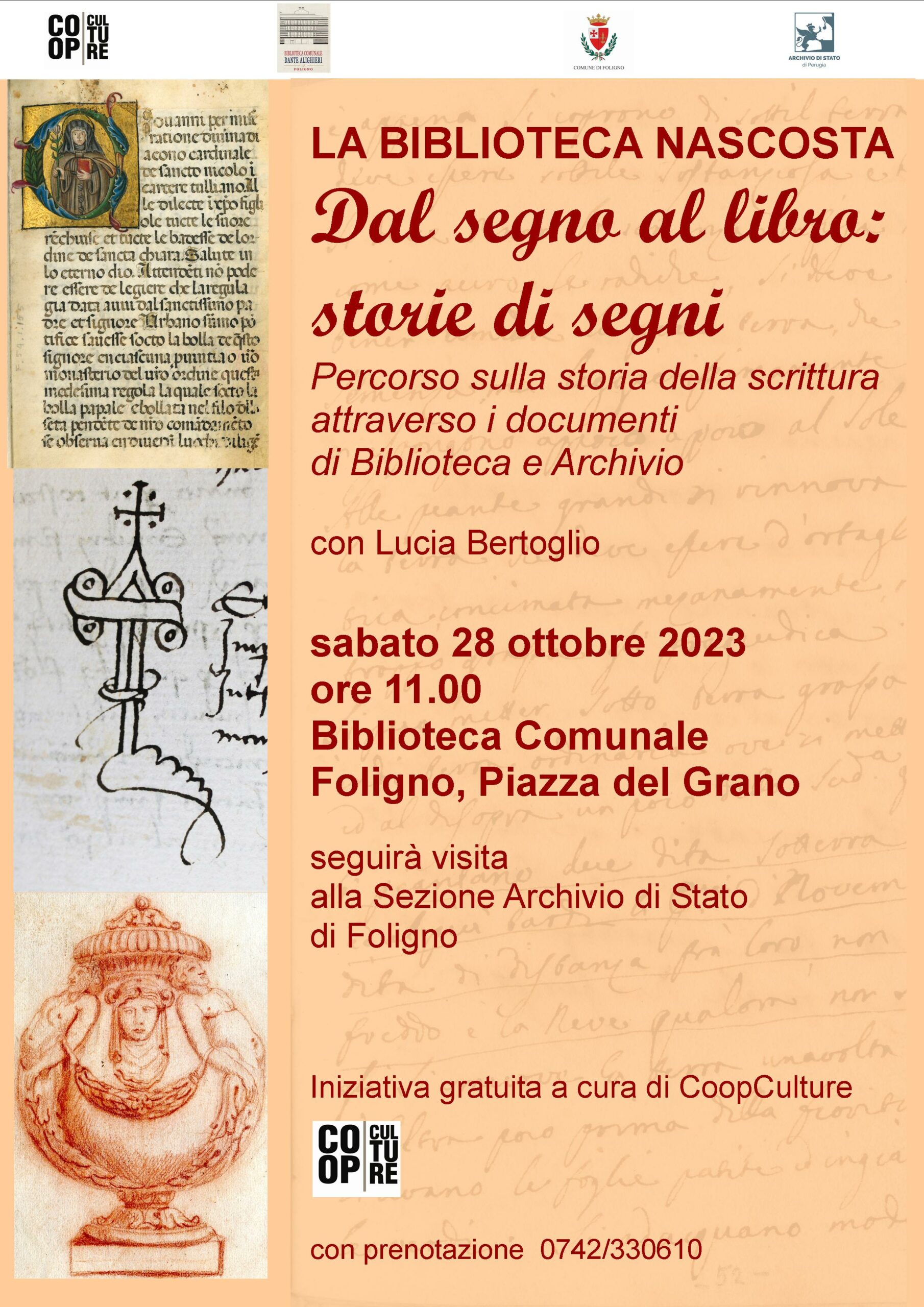 Dal segno al libro: Storie di segni, è un percorso sulla storia della scrittura attraverso i documenti di Biblioteca e Archivio con Lucia Bertoglio. Seguirà visita alla Sezione Archivio di Stato di Foligno.
