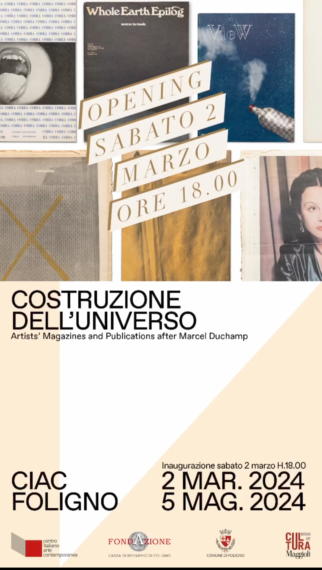COSTRUZIONE DELL’UNIVERSO: Artists’ Magazines and Publications after Marcel Duchamp è una ricerca ed una mostra che apre sabato 2 marzo 2024 nel museo CIAC Centro Italiano Arte Contemporanea di Foligno, progetto della Fondazione Cassa di Risparmio di Foligno, selezionata e curata da un importante archivio del contemporaneo.
