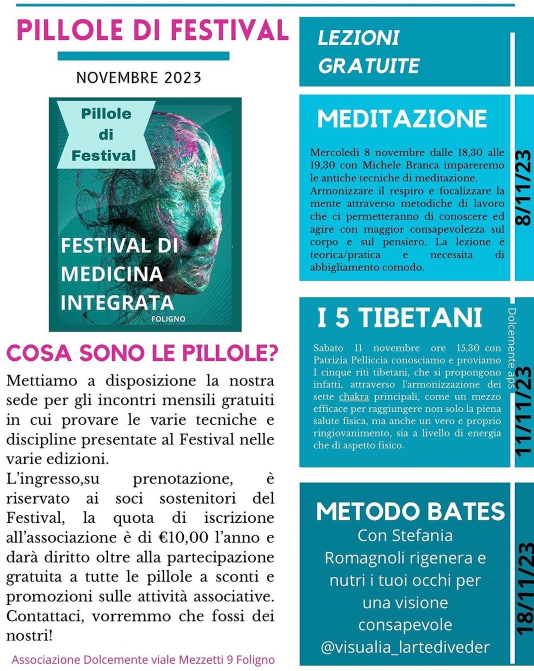 Cosa sono le pillole? Mettiamo a disposizione la nostra sede per gli incontri mensili gratuiti in cui provare le varie tecniche e discipline presentate al Festival nelle varie edizioni. L’ingresso, su prenotazione, è riservato ai soci sostenitori del Festival, la quota di iscrizione all’associazione è di €10.00 l’anno e darà diritto oltre alla partecipazione gratuita a tutte le pillole a sconti e promozioni sulle attività associative.